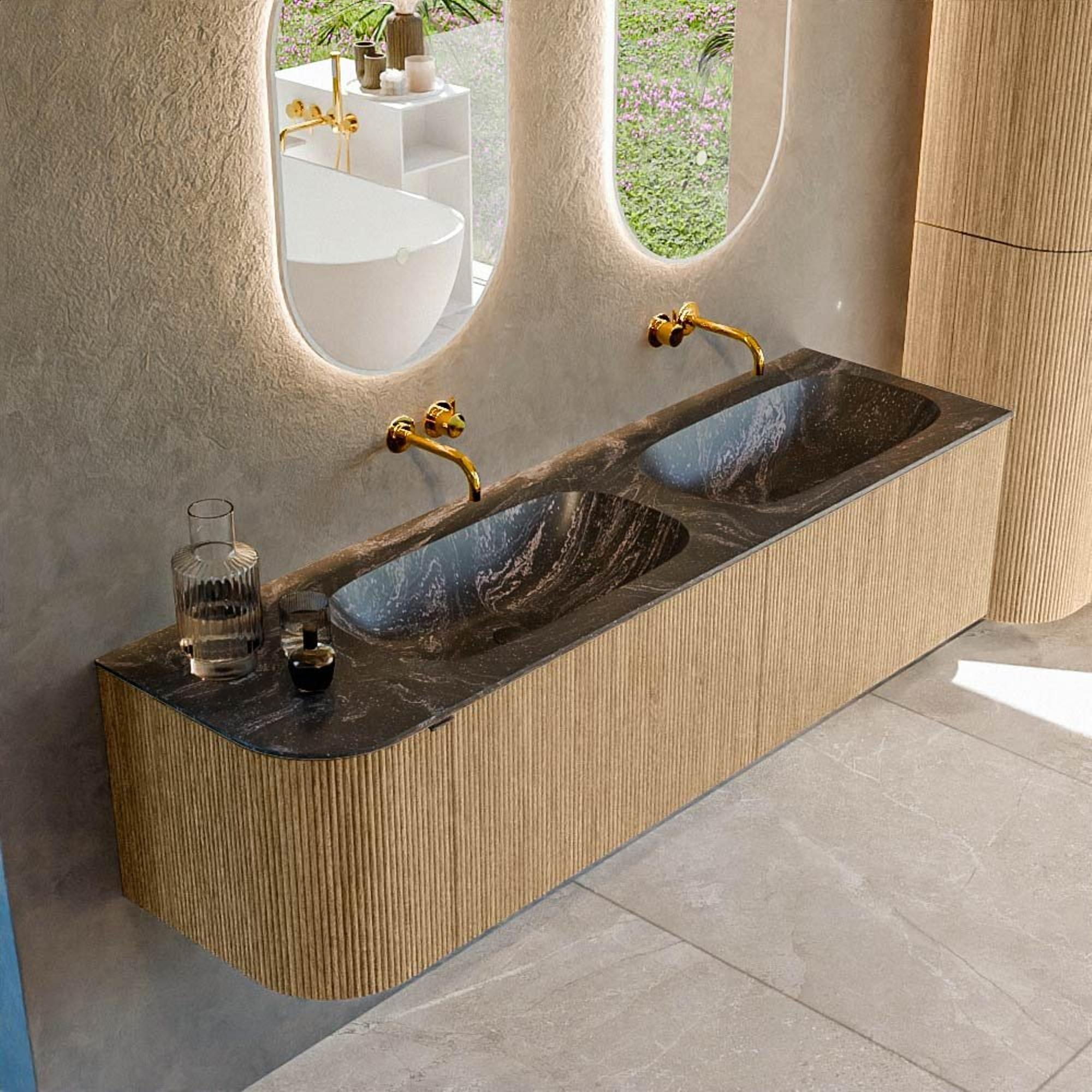 Het ultieme badmeubel dat je badkamer transformeert tot een oase van verfijning. Met zijn halfronde, verticale stroken van massief eiken, verkrijgbaar in de kleuren Oak en Walnut, straalt KURVE vakmanschap uit in elk detail. De zachte rondingen en slim ontworpen deurtjes, elk 40cm hoog, nodigen uit tot gebruik, terwijl de ruimte binnenin optimaal benut wordt dankzij de royale lade van dezelfde hoogte.