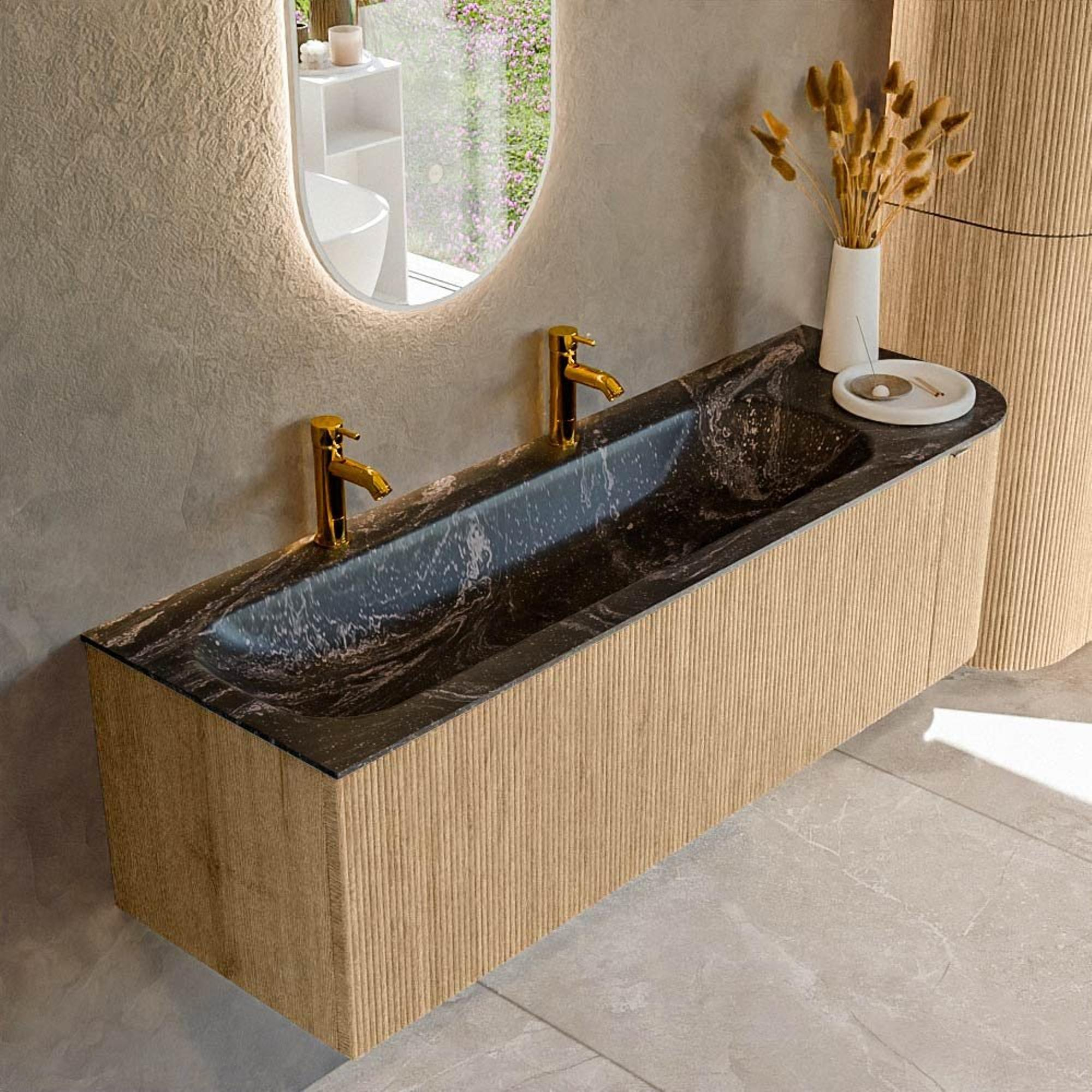 MONDIAZ KURVE-DLUX 145cm badmeubel met module 25 R kleur Oak met 1 lade en 1 deur. Wastafel BIG LARGE links 2 kraangaten kleur Lava.