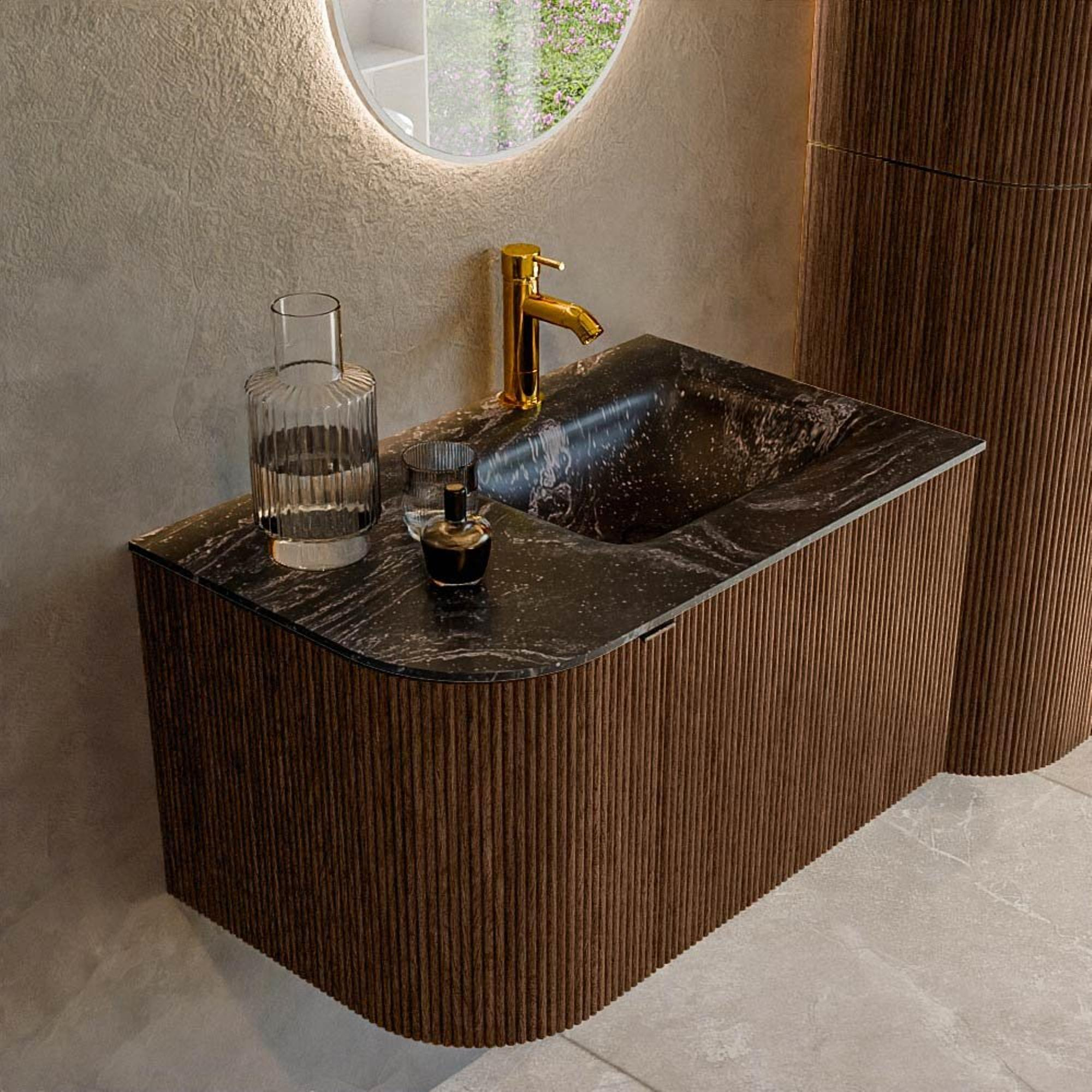 MONDIAZ KURVE-DLUX 75cm badmeubel met module 25 L kleur Walnut met 1 lade en 1 deur. Wastafel GRUNNE rechts 1 kraangat kleur Lava.