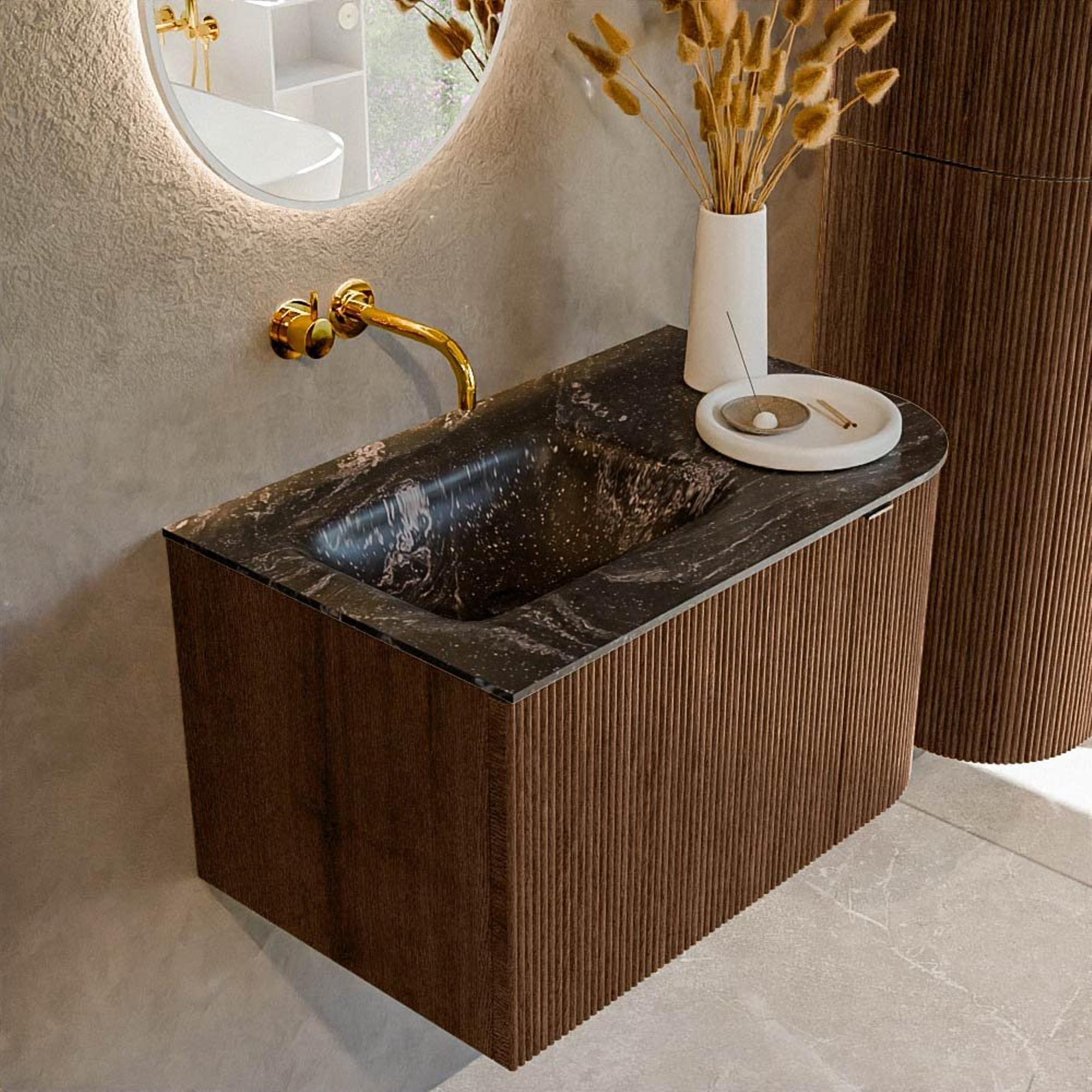 MONDIAZ KURVE-DLUX 75cm badmeubel met module 25 R kleur Walnut met 1 lade en 1 deur. Wastafel GRUNNE links zonder kraangat kleur Lava.