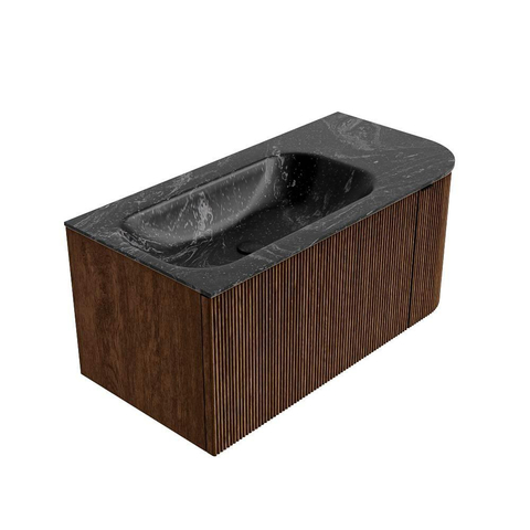 MONDIAZ KURVE-DLUX 95cm badmeubel met module 25 R kleur Walnut met 1 lade en 1 deur. Wastafel BIG SMALL links 1 kraangat kleur Lava.