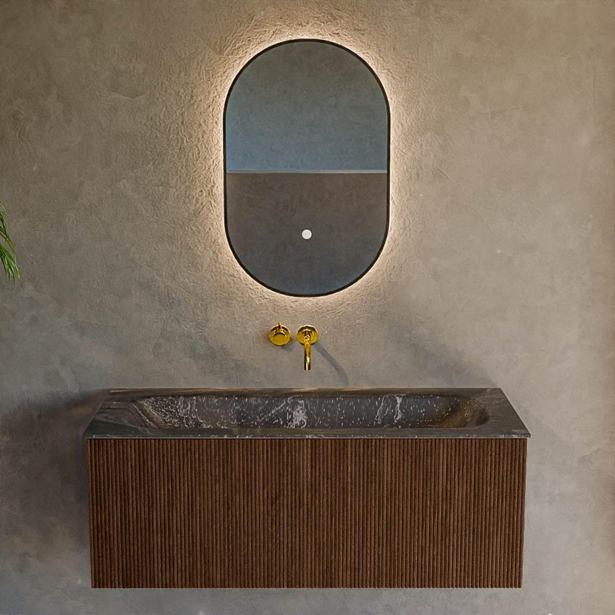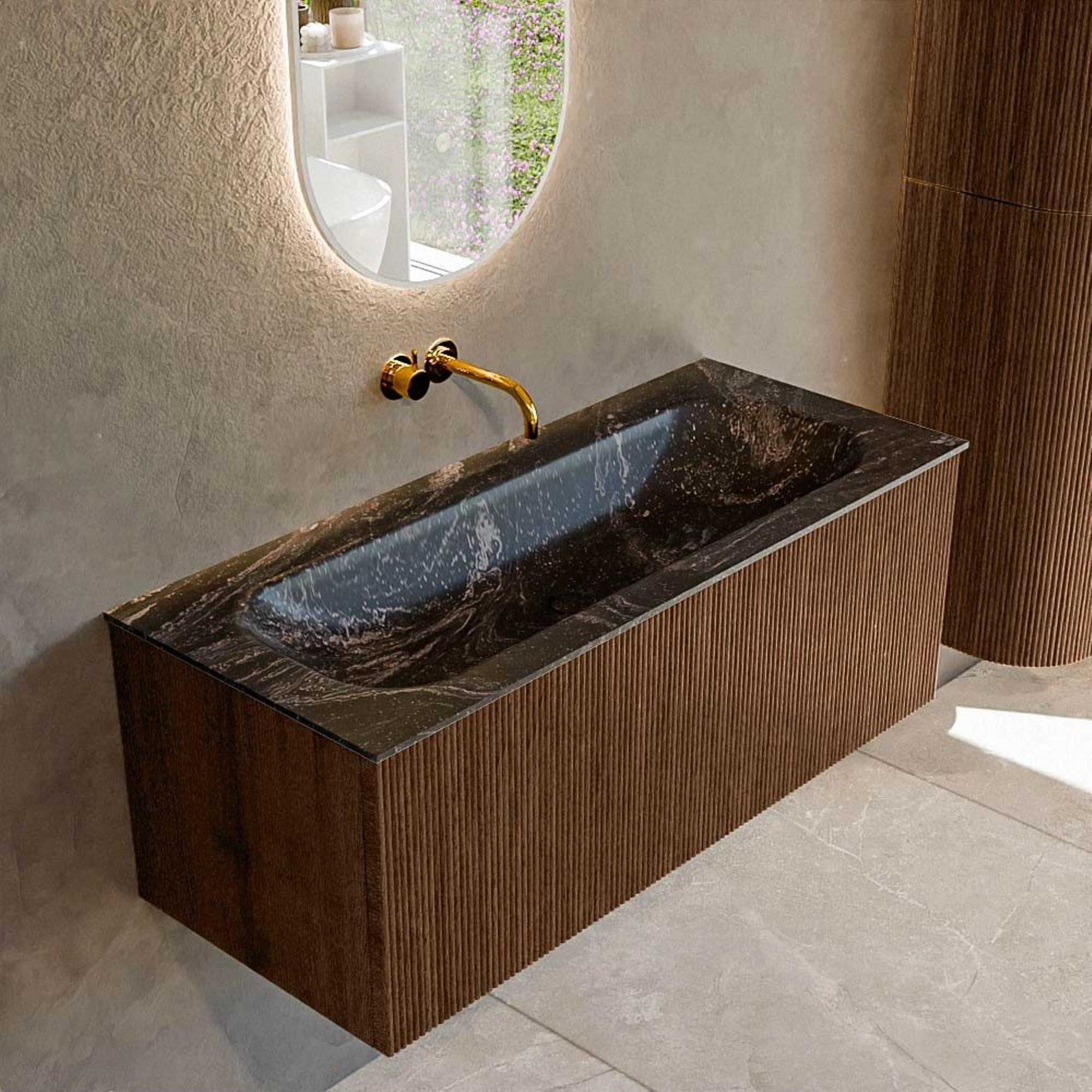 MONDIAZ KURVE-DLUX 110cm badmeubel kleur Walnut met 1 lade. Wastafel BIG MEDIUM midden zonder kraangat kleur Lava.