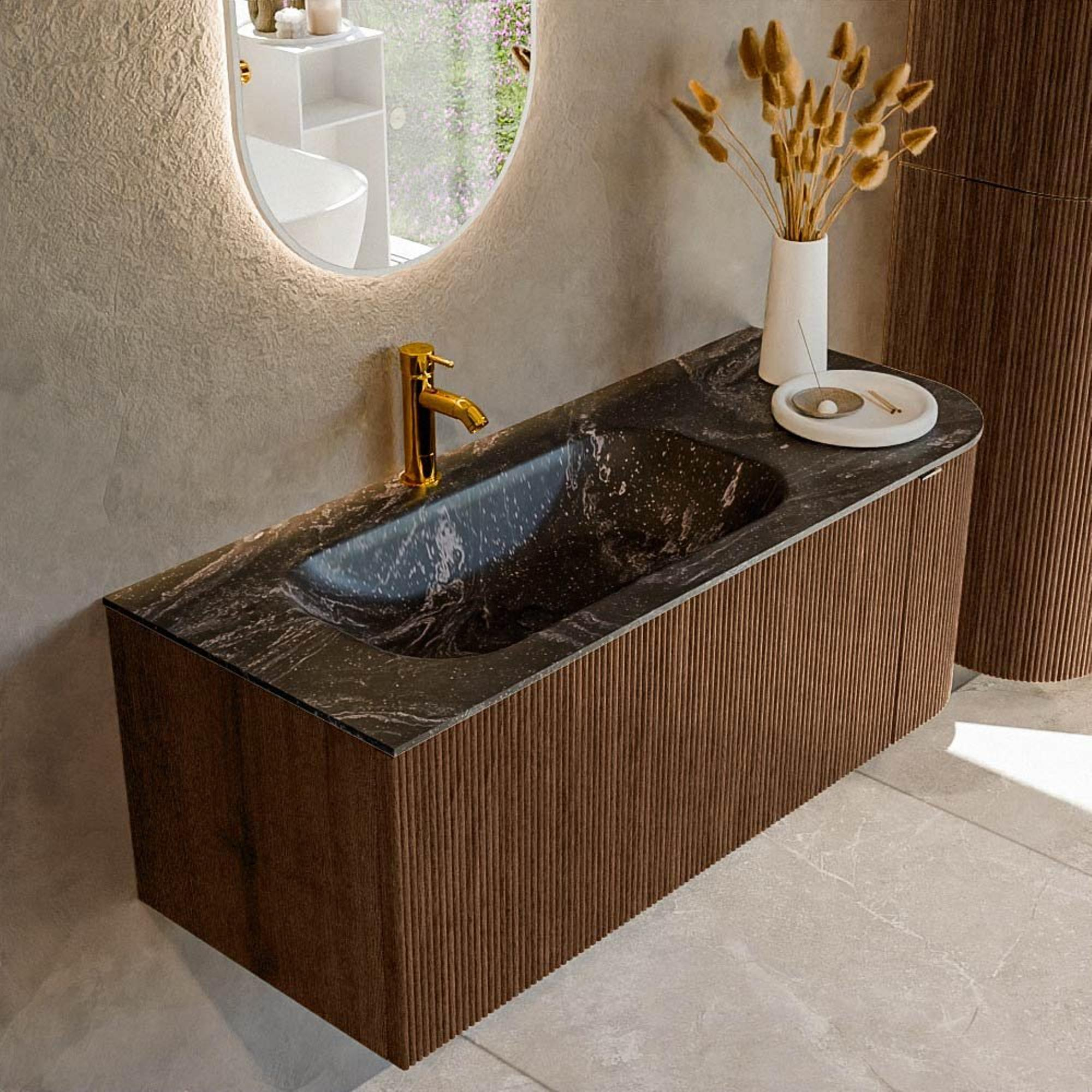 Het ultieme badmeubel dat je badkamer transformeert tot een oase van verfijning. Met zijn halfronde, verticale stroken van massief eiken, verkrijgbaar in de kleuren Oak en Walnut, straalt KURVE vakmanschap uit in elk detail. De zachte rondingen en slim ontworpen deurtjes, elk 40cm hoog, nodigen uit tot gebruik, terwijl de ruimte binnenin optimaal benut wordt dankzij de royale lade van dezelfde hoogte.