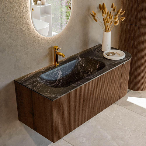 MONDIAZ KURVE-DLUX 115cm badmeubel met module 25 R kleur Walnut met 1 lade en 1 deur. Wastafel BIG SMALL links 1 kraangat kleur Lava.