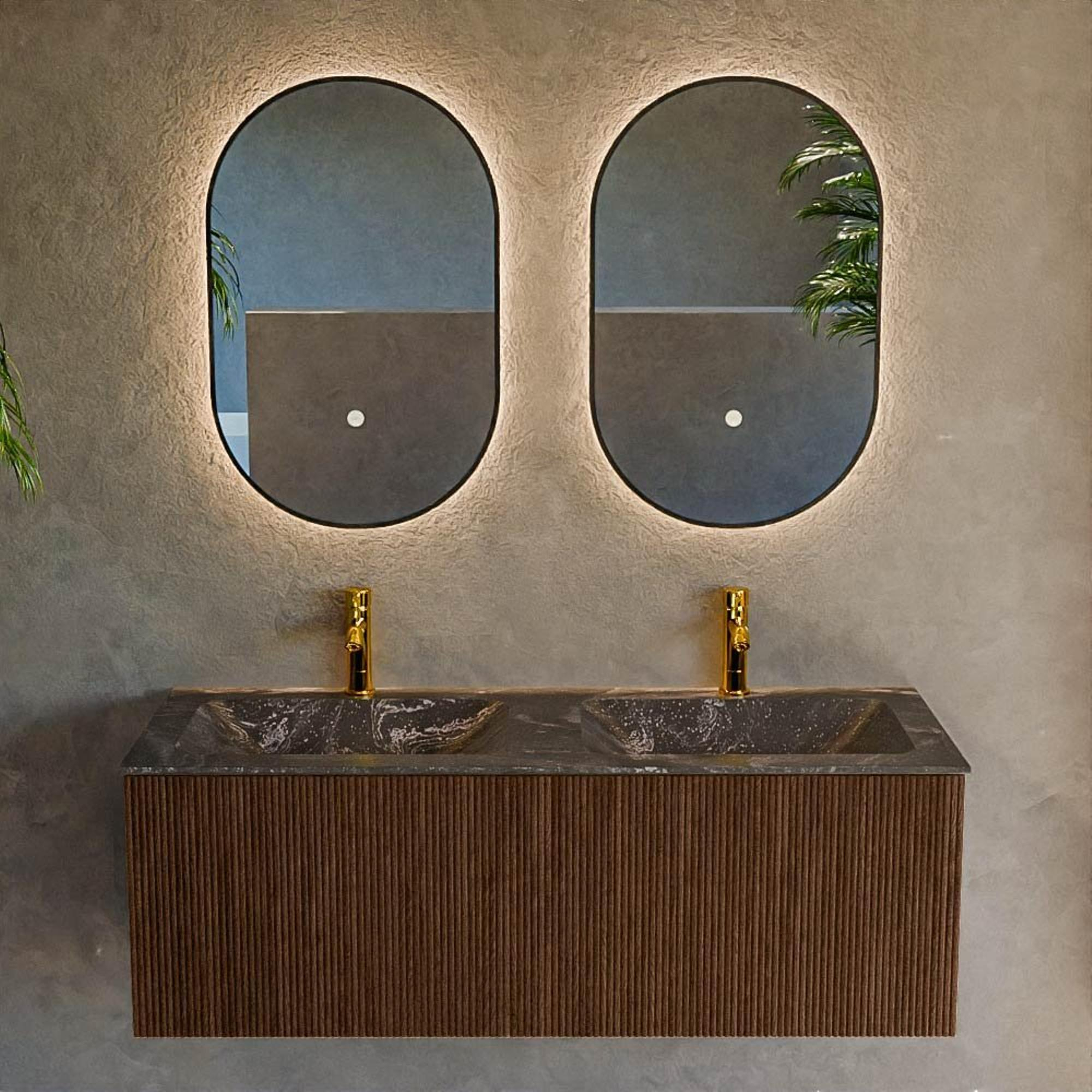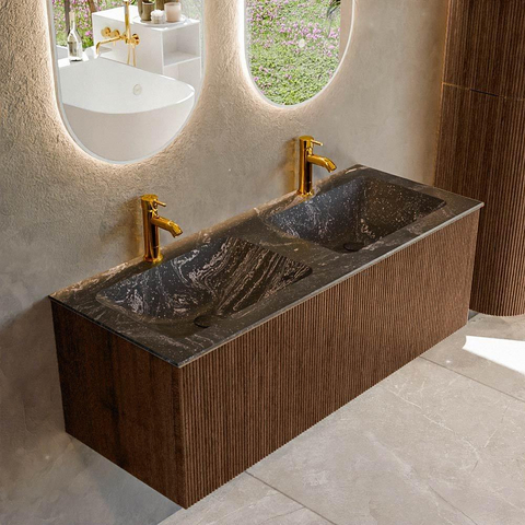 MONDIAZ KURVE-DLUX 120cm badmeubel kleur Walnut met 1 lade. Wastafel LEAF dubbel 2 kraangaten kleur Lava.