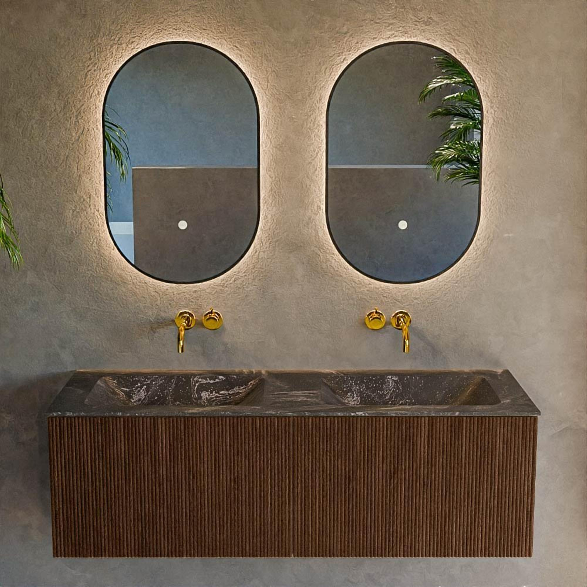 MONDIAZ KURVE-DLUX 130cm badmeubel kleur Walnut met 2 lades. Wastafel LEAF dubbel zonder kraangat kleur Lava.