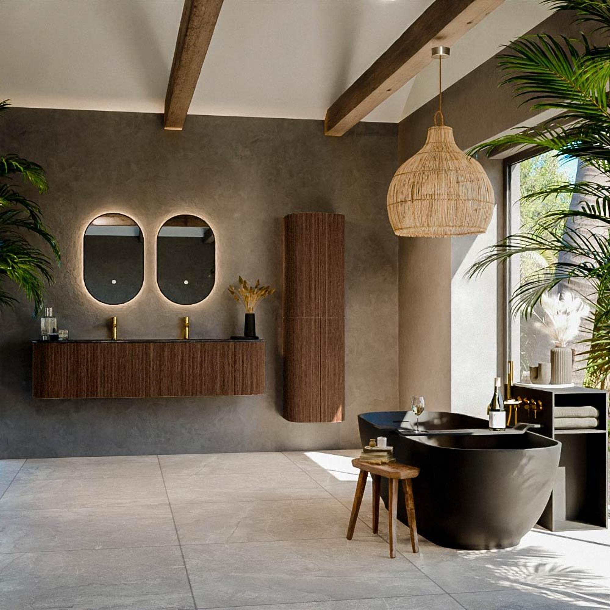 Het ultieme badmeubel dat je badkamer transformeert tot een oase van verfijning. Met zijn halfronde, verticale stroken van massief eiken, verkrijgbaar in de kleuren Oak en Walnut, straalt KURVE vakmanschap uit in elk detail. De zachte rondingen en slim ontworpen deurtjes, elk 40cm hoog, nodigen uit tot gebruik, terwijl de ruimte binnenin optimaal benut wordt dankzij de royale lade van dezelfde hoogte.
