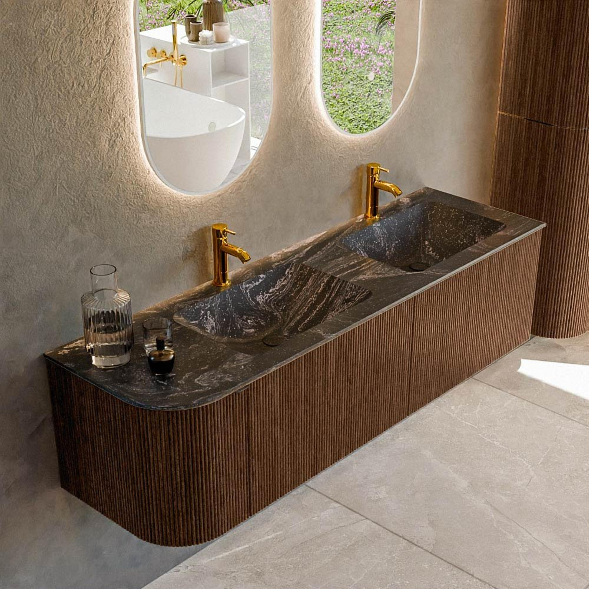 MONDIAZ KURVE-DLUX 155cm badmeubel met module 25 L kleur Walnut met 2 lades en 1 deur. Wastafel LEAF dubbel / rechts 2 kraangaten kleur Lava.
