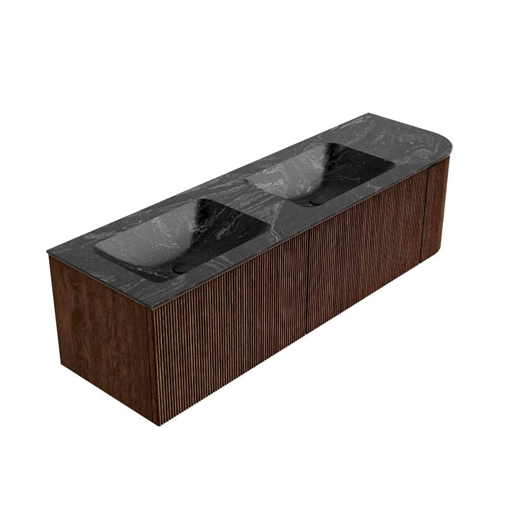 MONDIAZ KURVE-DLUX 155cm badmeubel met module 25 R kleur Walnut met 2 lades en 1 deur. Wastafel LEAF dubbel / links zonder kraangat kleur Lava.