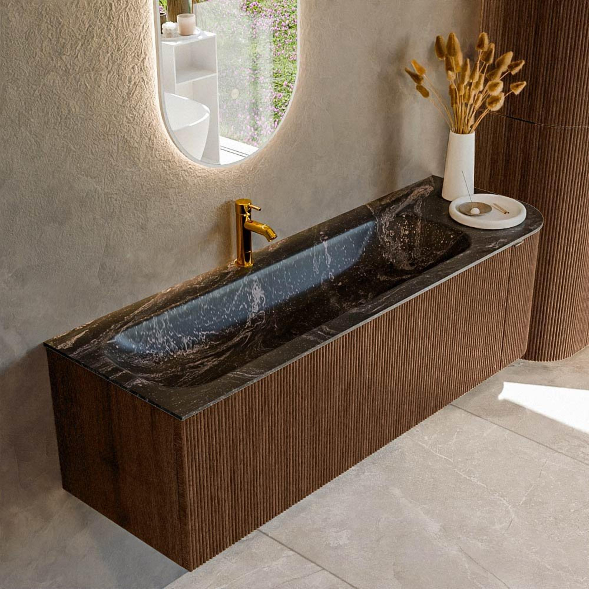 MONDIAZ KURVE-DLUX 145cm badmeubel met module 25 R kleur Walnut met 1 lade en 1 deur. Wastafel BIG LARGE links 1 kraangat kleur Lava.