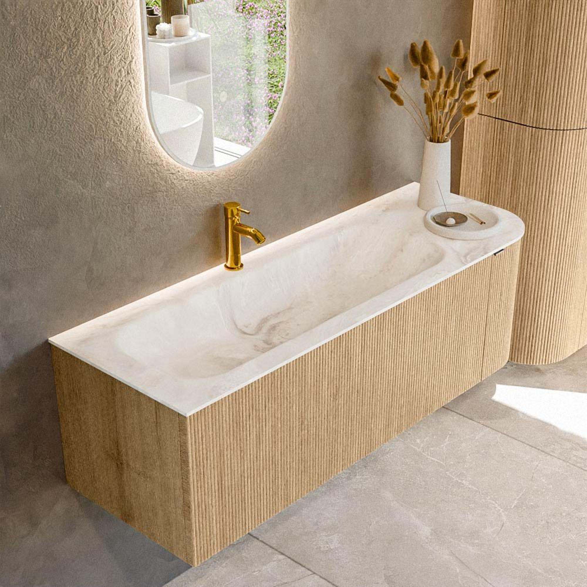 MONDIAZ KURVE-DLUX 135cm badmeubel met module 25 R kleur Oak met 1 lade en 1 deur. Wastafel BIG MEDIUM links 1 kraangat kleur Frappe.
