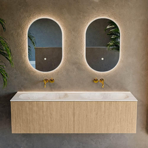 MONDIAZ KURVE-DLUX 150cm badmeubel kleur Oak met 2 lades. Wastafel STOR SMALL dubbel zonder kraangat kleur Frappe.