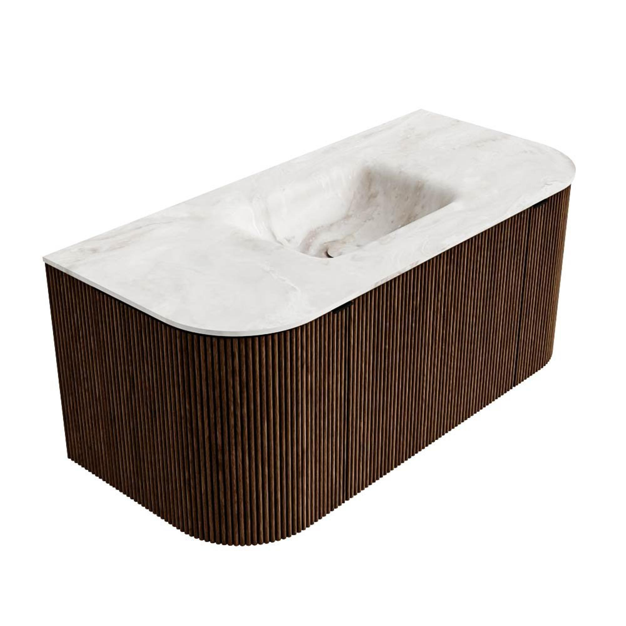 Het ultieme badmeubel dat je badkamer transformeert tot een oase van verfijning. Met zijn halfronde, verticale stroken van massief eiken, verkrijgbaar in de kleuren Oak en Walnut, straalt KURVE vakmanschap uit in elk detail. De zachte rondingen en slim ontworpen deurtjes, elk 40cm hoog, nodigen uit tot gebruik, terwijl de ruimte binnenin optimaal benut wordt dankzij de royale lade van dezelfde hoogte.
