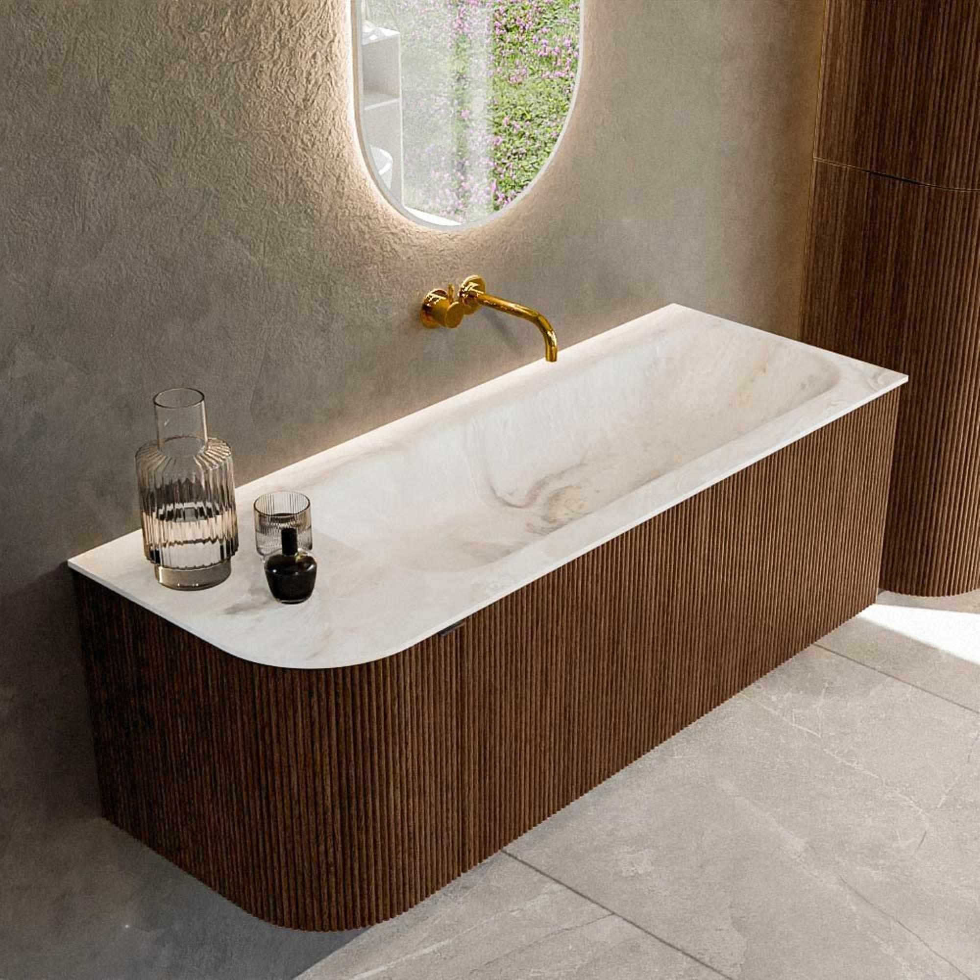 Het ultieme badmeubel dat je badkamer transformeert tot een oase van verfijning. Met zijn halfronde, verticale stroken van massief eiken, verkrijgbaar in de kleuren Oak en Walnut, straalt KURVE vakmanschap uit in elk detail. De zachte rondingen en slim ontworpen deurtjes, elk 40cm hoog, nodigen uit tot gebruik, terwijl de ruimte binnenin optimaal benut wordt dankzij de royale lade van dezelfde hoogte.
