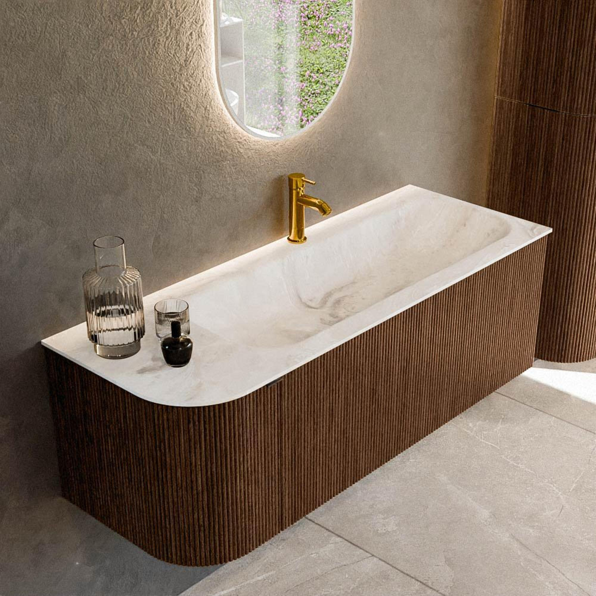 Het ultieme badmeubel dat je badkamer transformeert tot een oase van verfijning. Met zijn halfronde, verticale stroken van massief eiken, verkrijgbaar in de kleuren Oak en Walnut, straalt KURVE vakmanschap uit in elk detail. De zachte rondingen en slim ontworpen deurtjes, elk 40cm hoog, nodigen uit tot gebruik, terwijl de ruimte binnenin optimaal benut wordt dankzij de royale lade van dezelfde hoogte.