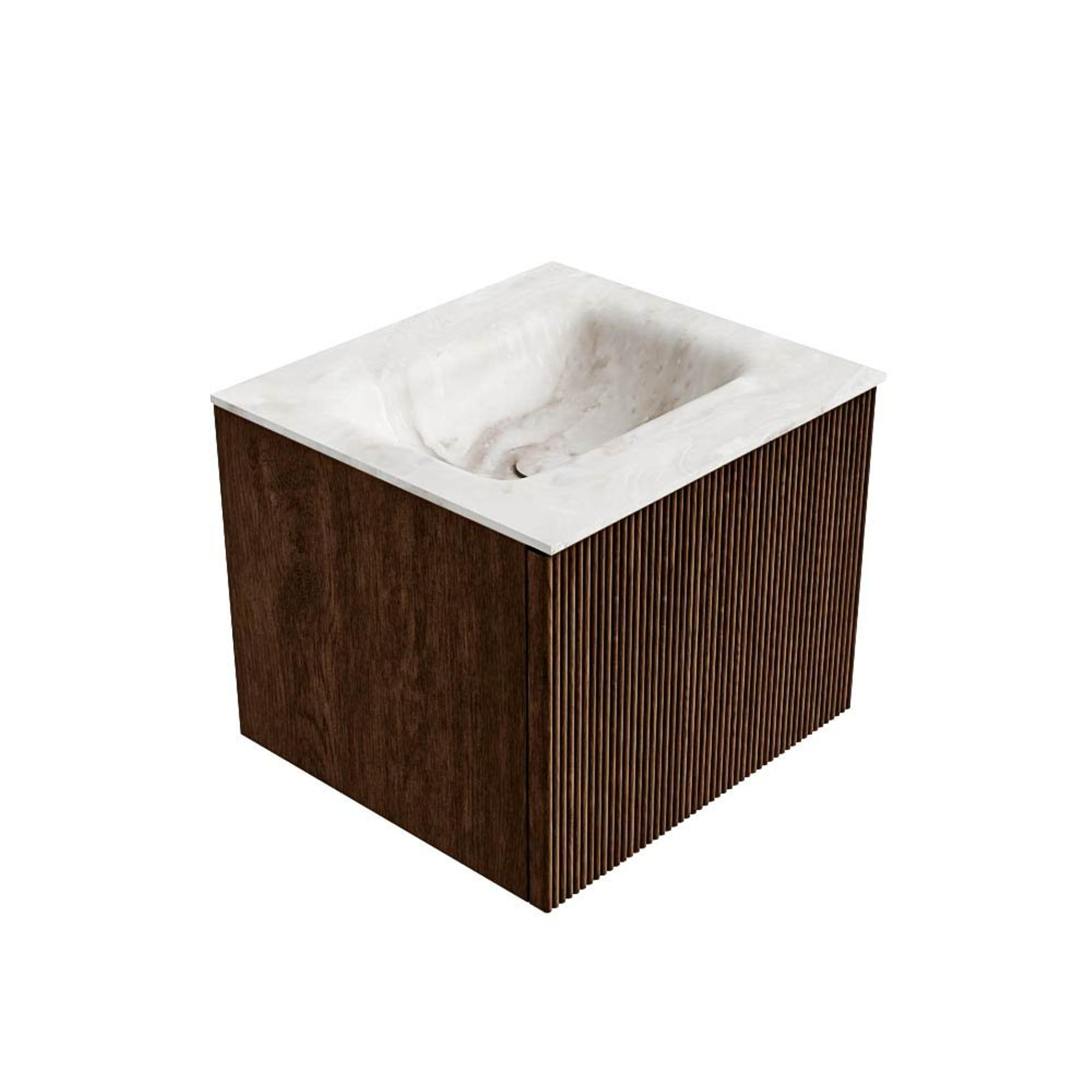 MONDIAZ KURVE-DLUX 50cm badmeubel kleur Walnut met 1 lade. Wastafel GRUNNE midden zonder kraangat kleur Frappe.