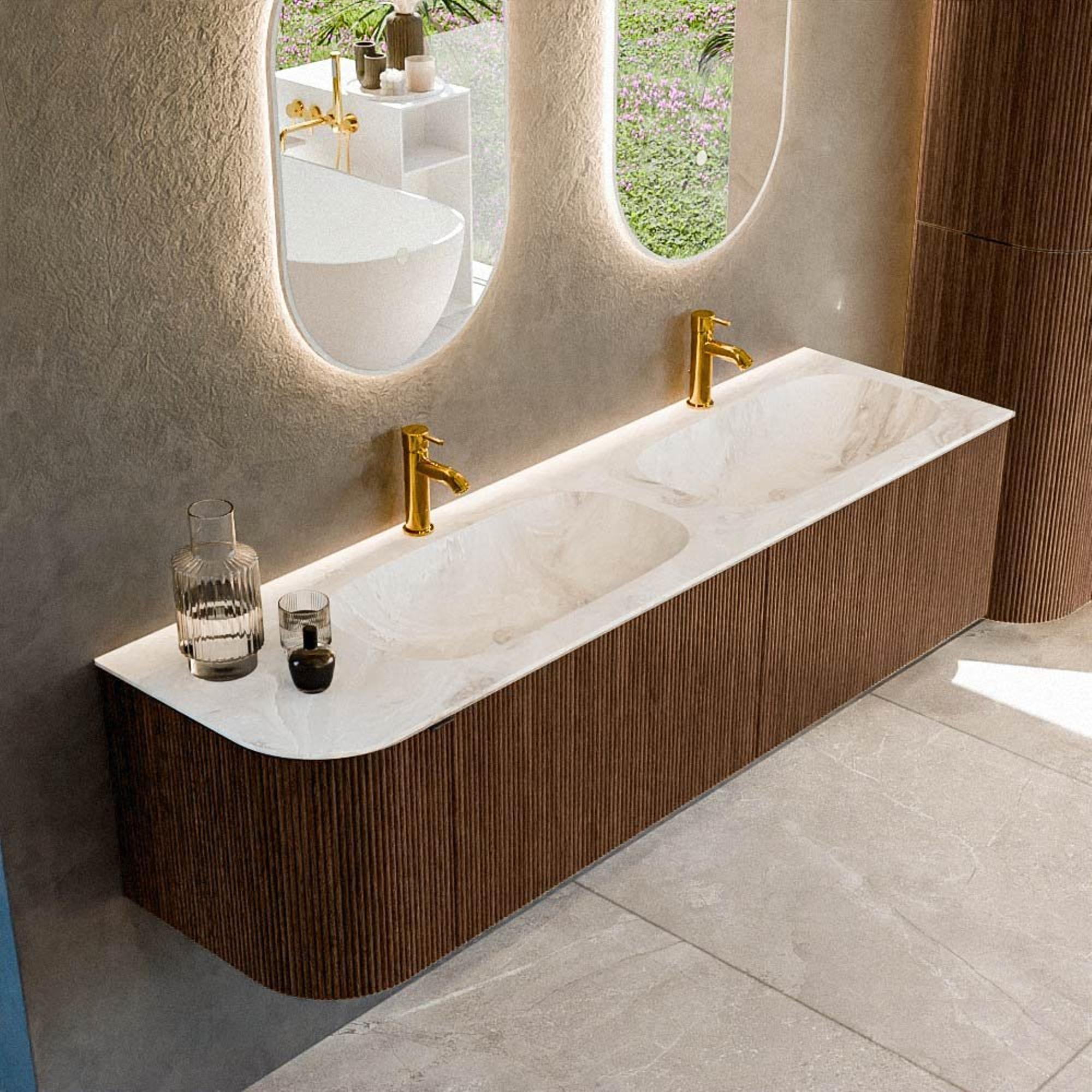 Het ultieme badmeubel dat je badkamer transformeert tot een oase van verfijning. Met zijn halfronde, verticale stroken van massief eiken, verkrijgbaar in de kleuren Oak en Walnut, straalt KURVE vakmanschap uit in elk detail. De zachte rondingen en slim ontworpen deurtjes, elk 40cm hoog, nodigen uit tot gebruik, terwijl de ruimte binnenin optimaal benut wordt dankzij de royale lade van dezelfde hoogte.