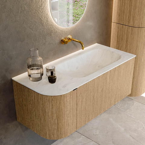 Het ultieme badmeubel dat je badkamer transformeert tot een oase van verfijning. Met zijn halfronde, verticale stroken van massief eiken, verkrijgbaar in de kleuren Oak en Walnut, straalt KURVE vakmanschap uit in elk detail. De zachte rondingen en slim ontworpen deurtjes, elk 40cm hoog, nodigen uit tot gebruik, terwijl de ruimte binnenin optimaal benut wordt dankzij de royale lade van dezelfde hoogte.