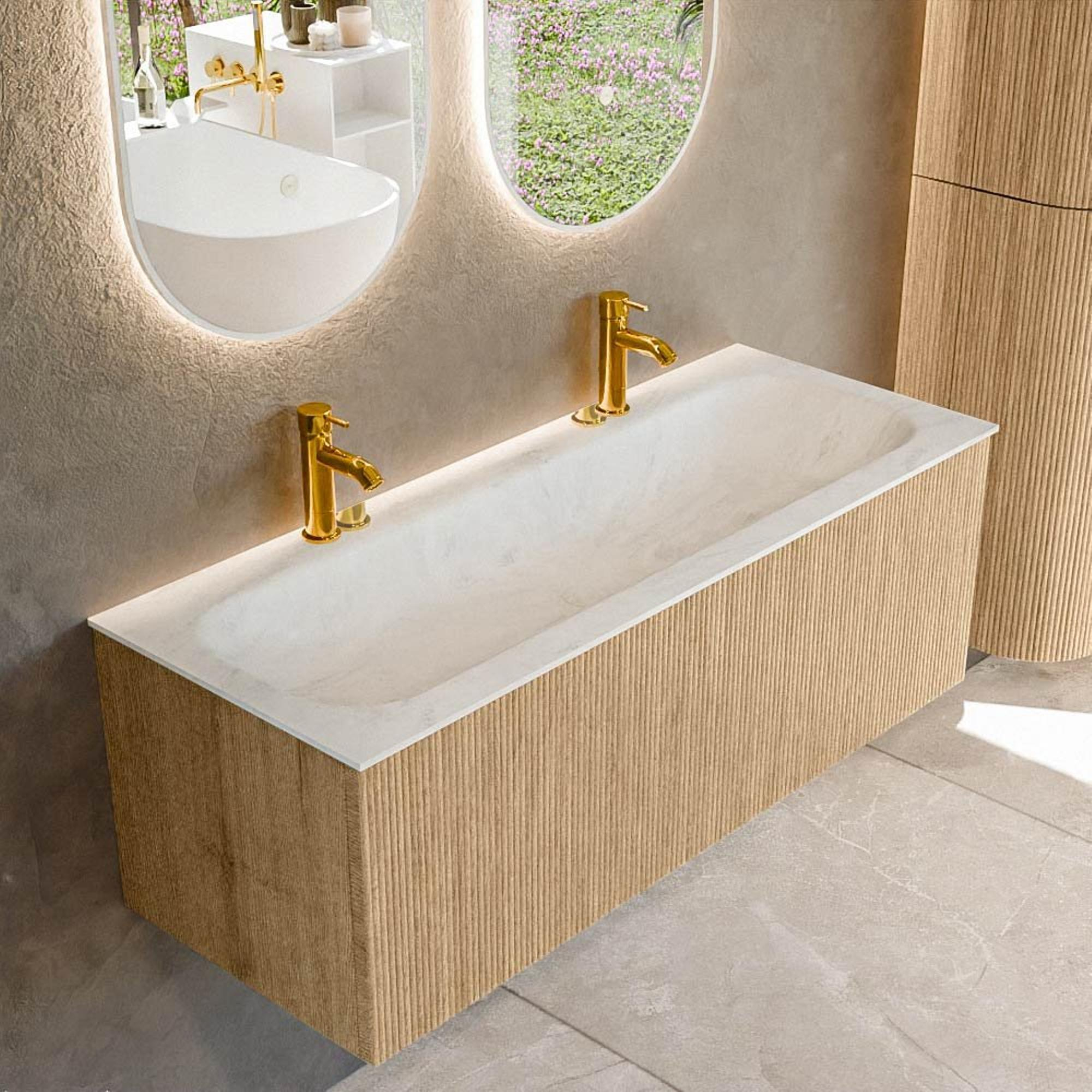 MONDIAZ KURVE-DLUX 120cm badmeubel kleur Oak met 1 lade. Wastafel BIG LARGE midden 2 kraangaten kleur Opalo.