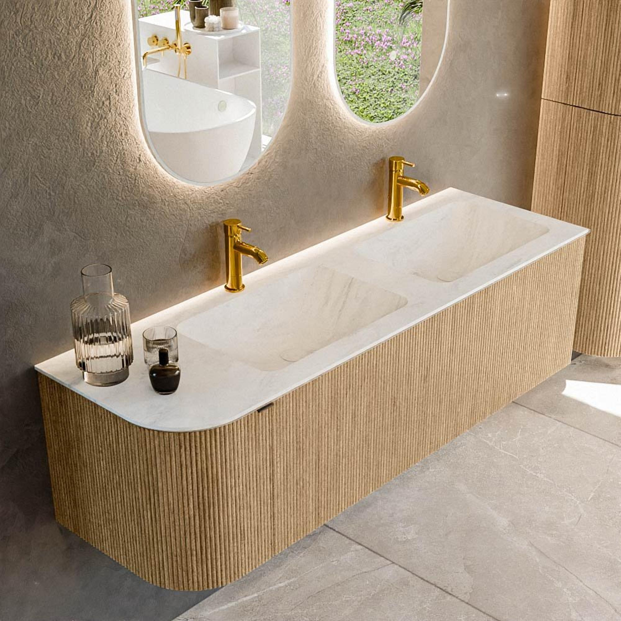 Het ultieme badmeubel dat je badkamer transformeert tot een oase van verfijning. Met zijn halfronde, verticale stroken van massief eiken, verkrijgbaar in de kleuren Oak en Walnut, straalt KURVE vakmanschap uit in elk detail. De zachte rondingen en slim ontworpen deurtjes, elk 40cm hoog, nodigen uit tot gebruik, terwijl de ruimte binnenin optimaal benut wordt dankzij de royale lade van dezelfde hoogte.