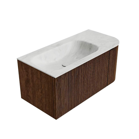 MONDIAZ KURVE-DLUX 95cm badmeubel met module 25 R kleur Walnut met 1 lade en 1 deur. Wastafel BIG SMALL links 1 kraangat kleur Opalo.