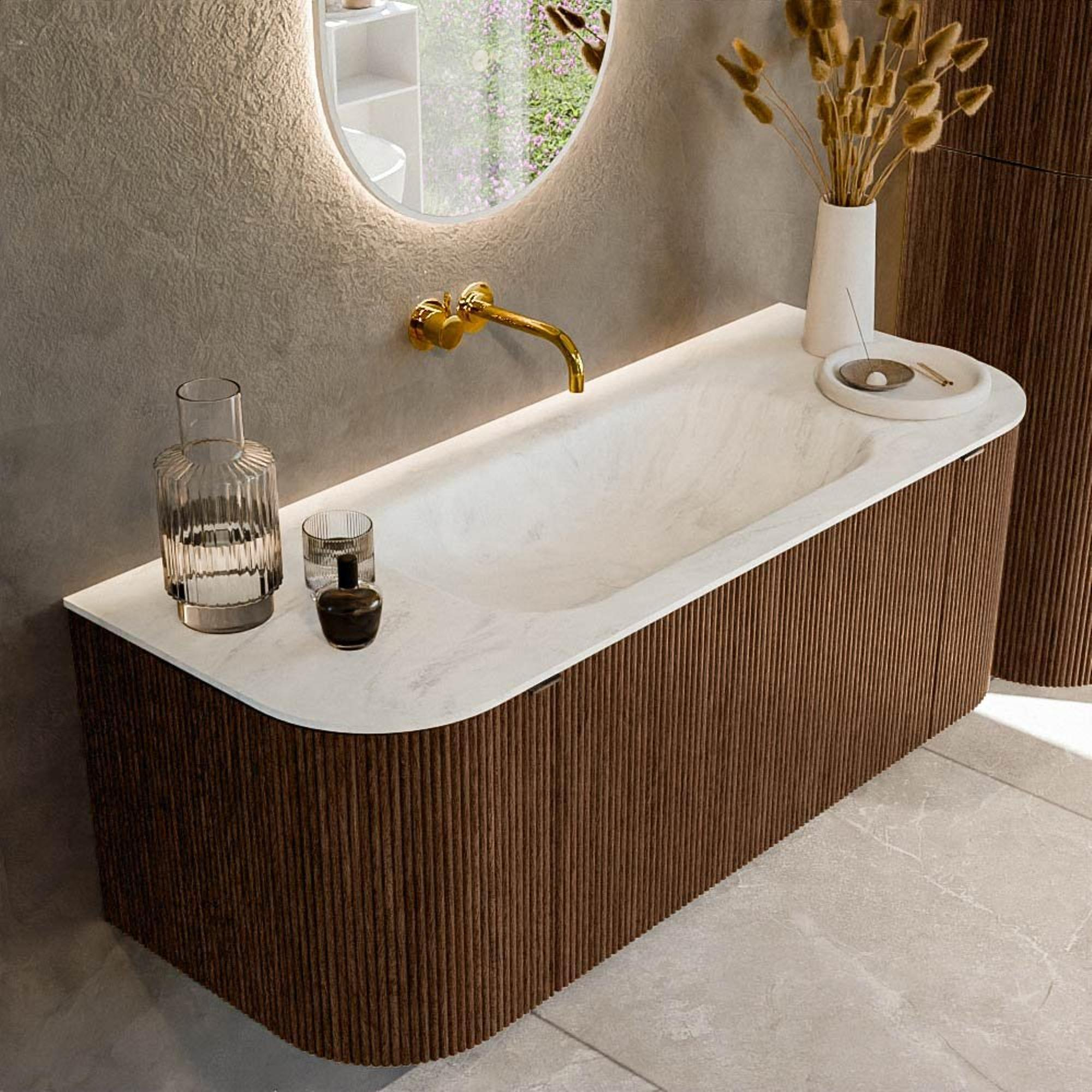 Het ultieme badmeubel dat je badkamer transformeert tot een oase van verfijning. Met zijn halfronde, verticale stroken van massief eiken, verkrijgbaar in de kleuren Oak en Walnut, straalt KURVE vakmanschap uit in elk detail. De zachte rondingen en slim ontworpen deurtjes, elk 40cm hoog, nodigen uit tot gebruik, terwijl de ruimte binnenin optimaal benut wordt dankzij de royale lade van dezelfde hoogte.