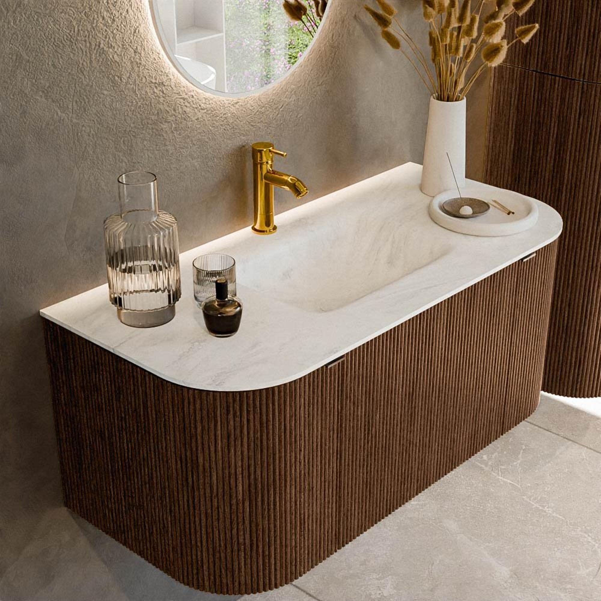 MONDIAZ KURVE-DLUX 100cm badmeubel met module 25 Len R kleur Walnut met 1 lade en 2 deuren. Wastafel GRUNNE midden 1 kraangat kleur Opalo.