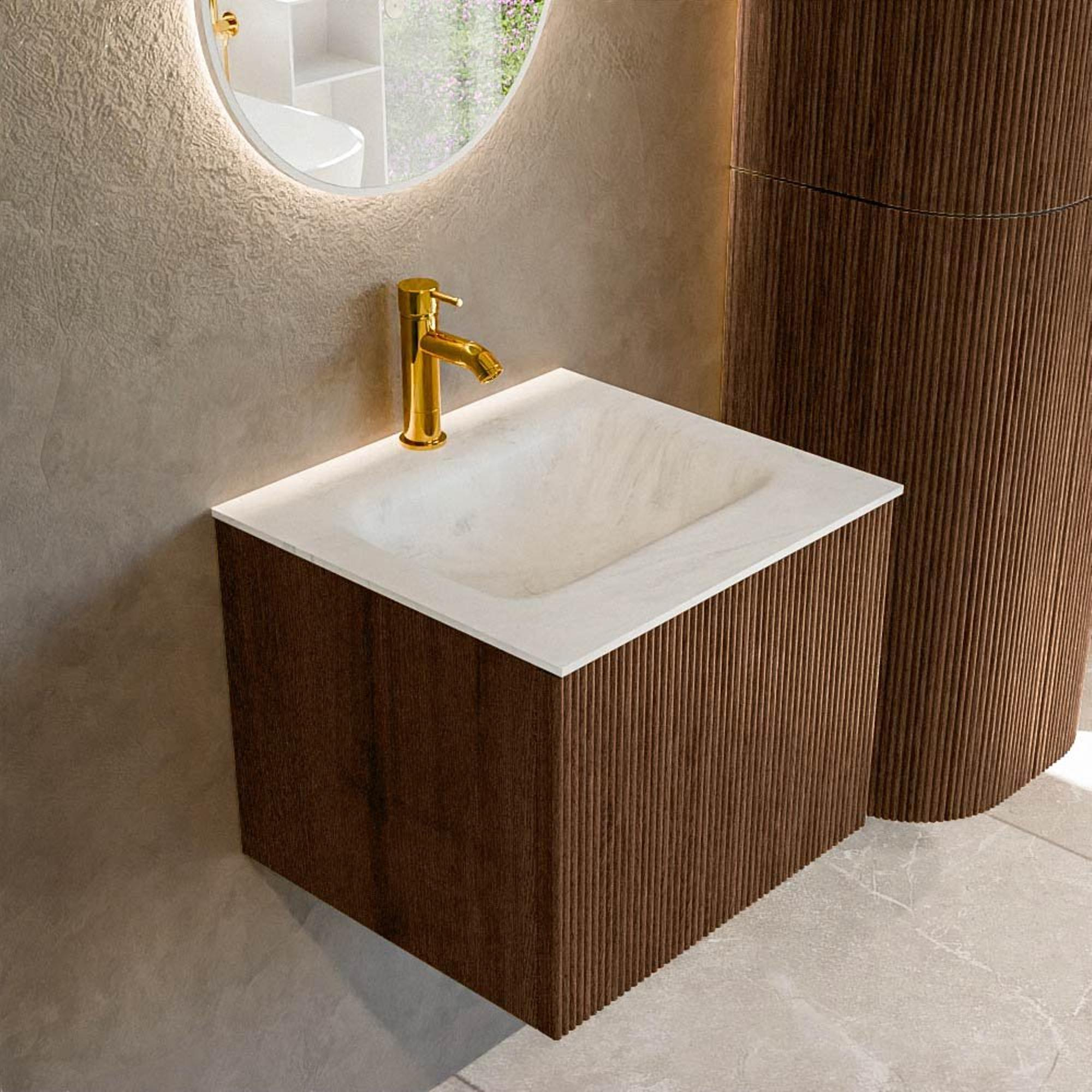 MONDIAZ KURVE-DLUX 50cm badmeubel kleur Walnut met 1 lade. Wastafel GRUNNE midden 1 kraangat kleur Opalo.