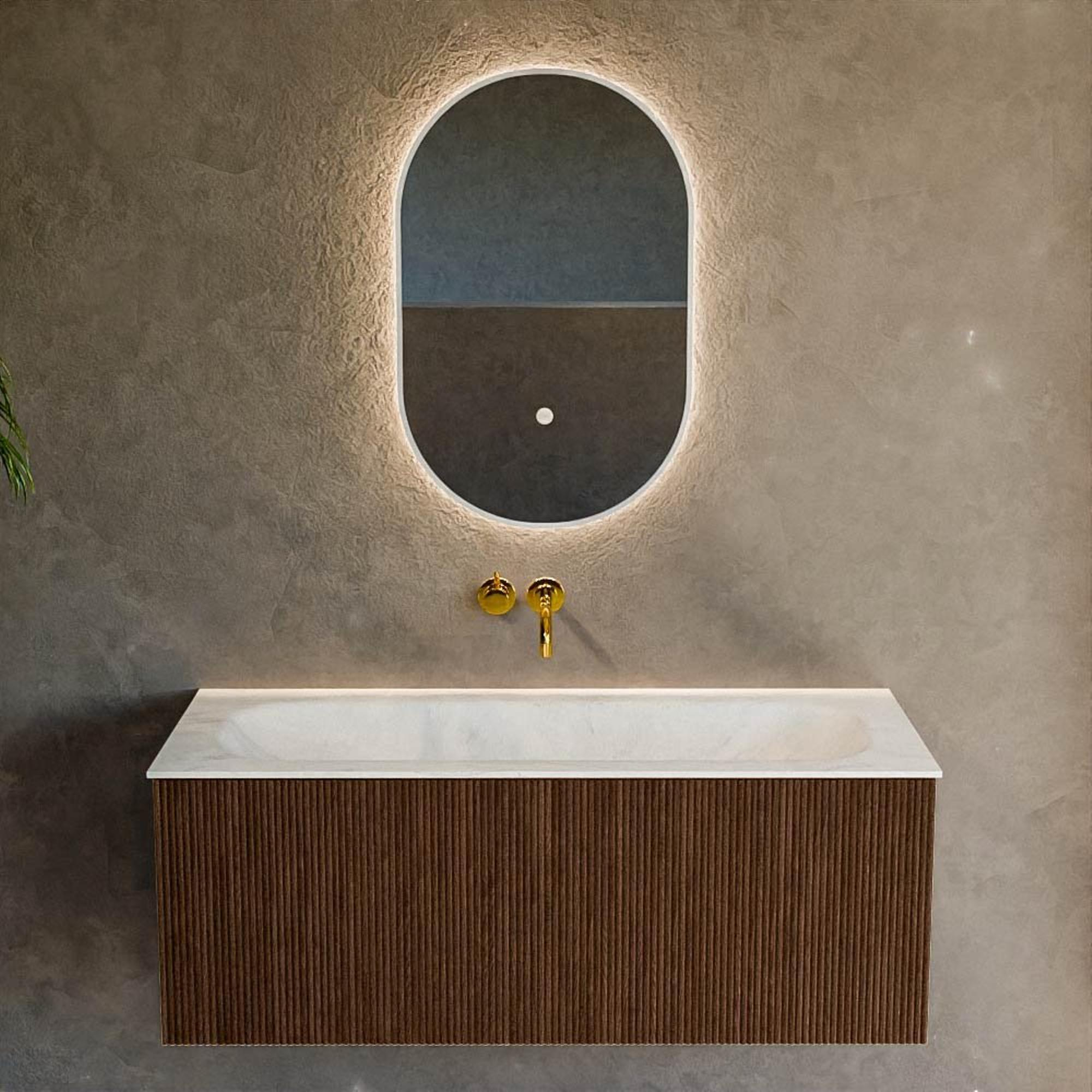 Het ultieme badmeubel dat je badkamer transformeert tot een oase van verfijning. Met zijn halfronde, verticale stroken van massief eiken, verkrijgbaar in de kleuren Oak en Walnut, straalt KURVE vakmanschap uit in elk detail. De zachte rondingen en slim ontworpen deurtjes, elk 40cm hoog, nodigen uit tot gebruik, terwijl de ruimte binnenin optimaal benut wordt dankzij de royale lade van dezelfde hoogte.