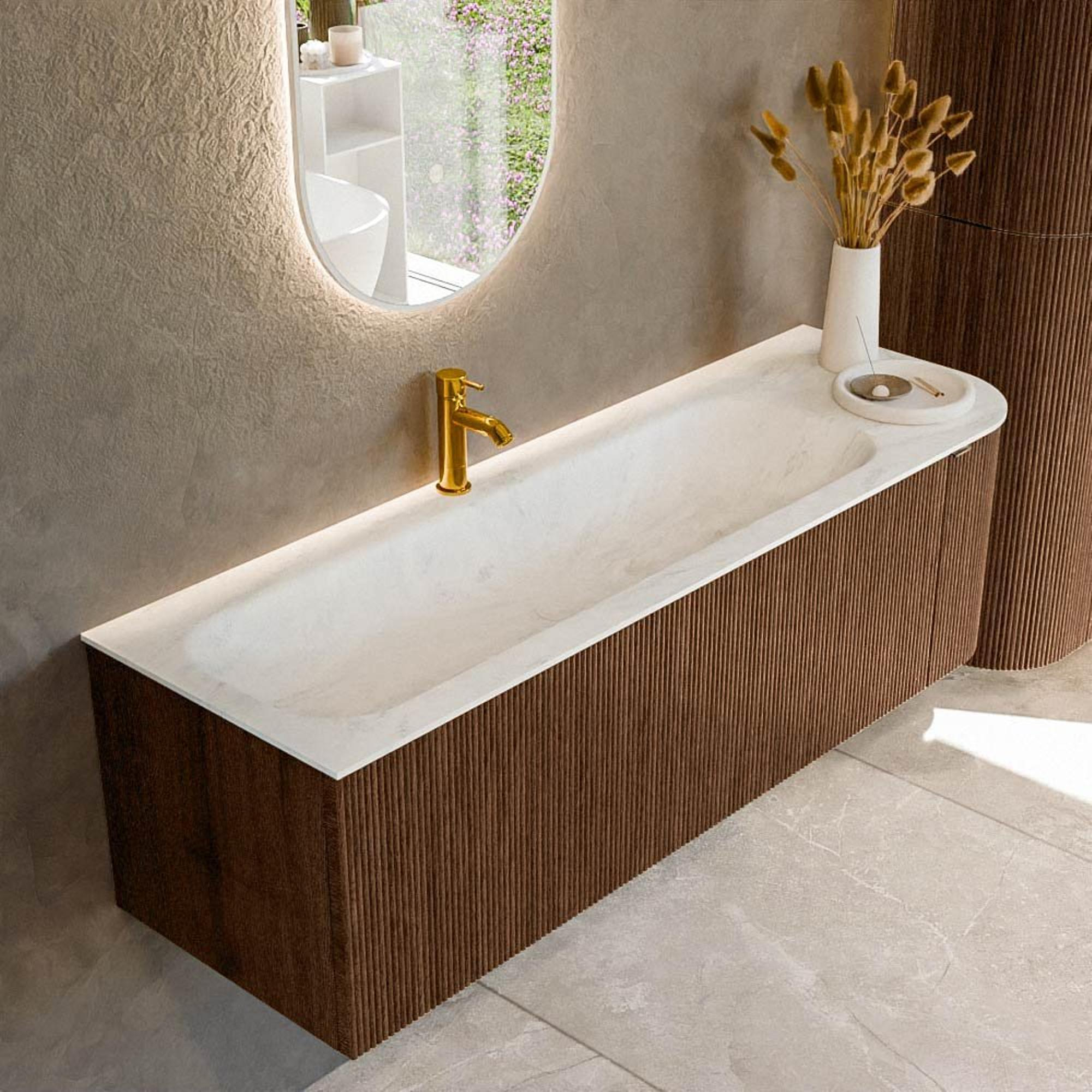 MONDIAZ KURVE-DLUX 145cm badmeubel met module 25 R kleur Walnut met 1 lade en 1 deur. Wastafel BIG LARGE links 1 kraangat kleur Opalo.
