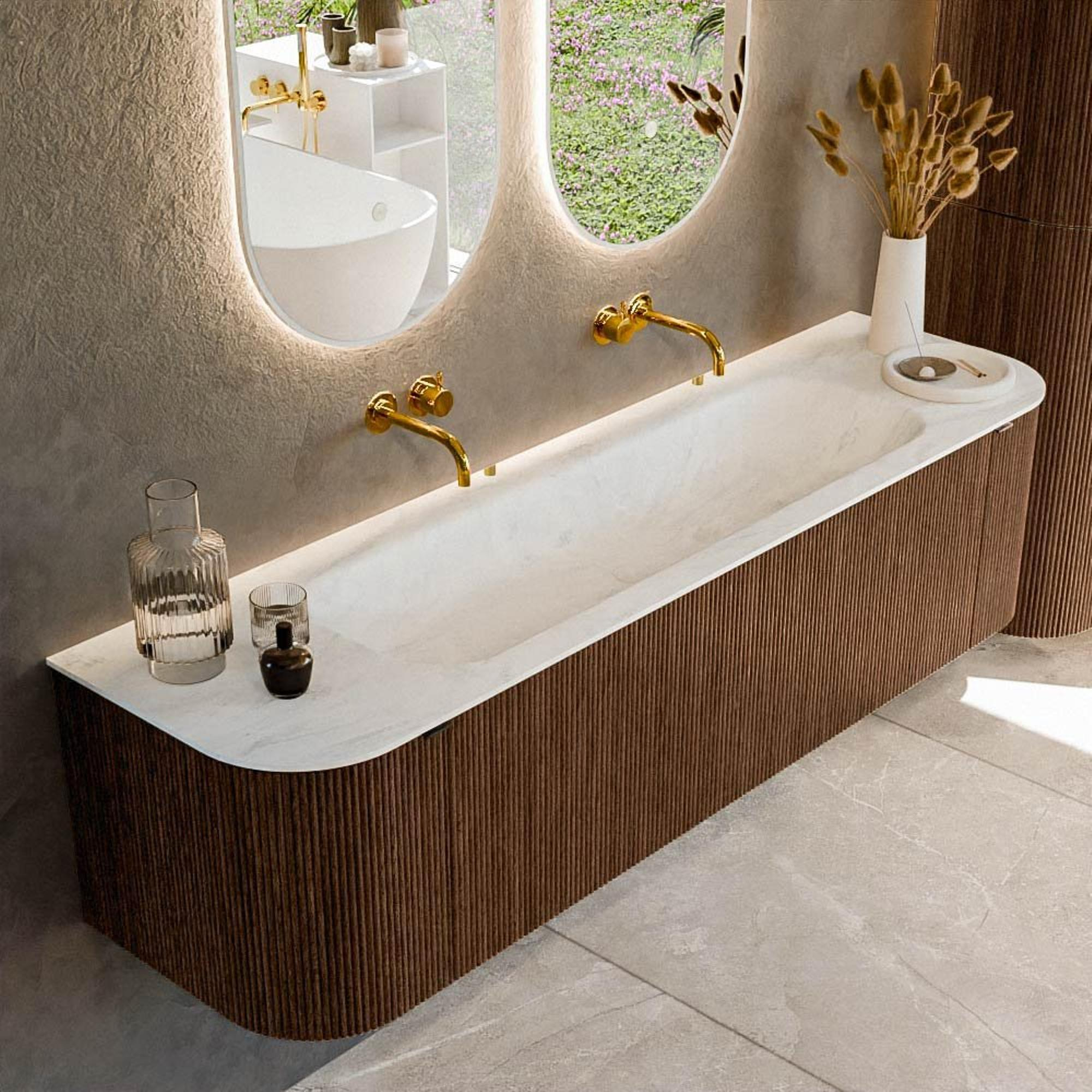 Het ultieme badmeubel dat je badkamer transformeert tot een oase van verfijning. Met zijn halfronde, verticale stroken van massief eiken, verkrijgbaar in de kleuren Oak en Walnut, straalt KURVE vakmanschap uit in elk detail. De zachte rondingen en slim ontworpen deurtjes, elk 40cm hoog, nodigen uit tot gebruik, terwijl de ruimte binnenin optimaal benut wordt dankzij de royale lade van dezelfde hoogte.