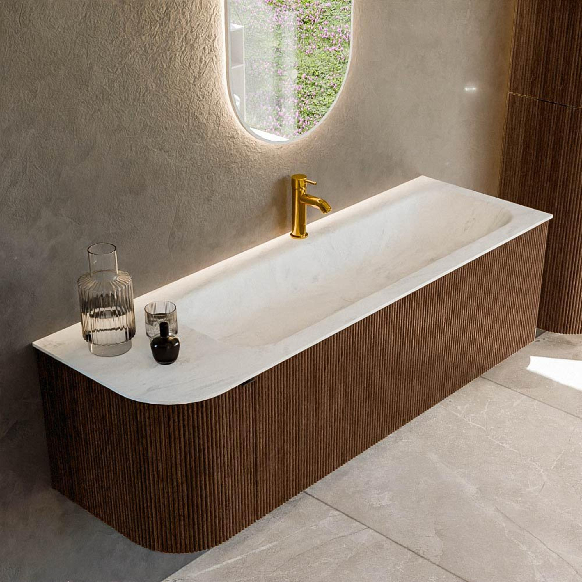 Het ultieme badmeubel dat je badkamer transformeert tot een oase van verfijning. Met zijn halfronde, verticale stroken van massief eiken, verkrijgbaar in de kleuren Oak en Walnut, straalt KURVE vakmanschap uit in elk detail. De zachte rondingen en slim ontworpen deurtjes, elk 40cm hoog, nodigen uit tot gebruik, terwijl de ruimte binnenin optimaal benut wordt dankzij de royale lade van dezelfde hoogte.