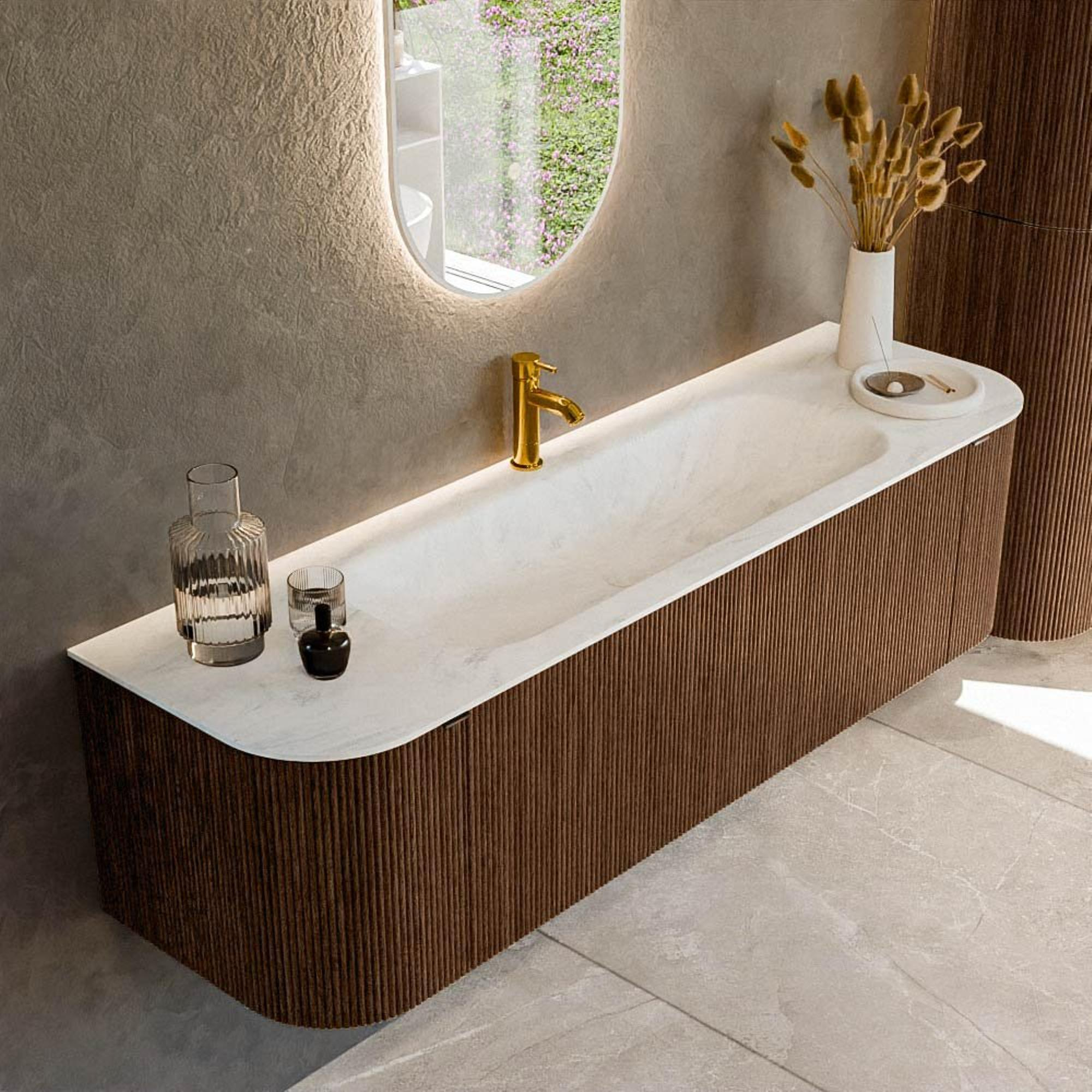 Het ultieme badmeubel dat je badkamer transformeert tot een oase van verfijning. Met zijn halfronde, verticale stroken van massief eiken, verkrijgbaar in de kleuren Oak en Walnut, straalt KURVE vakmanschap uit in elk detail. De zachte rondingen en slim ontworpen deurtjes, elk 40cm hoog, nodigen uit tot gebruik, terwijl de ruimte binnenin optimaal benut wordt dankzij de royale lade van dezelfde hoogte.