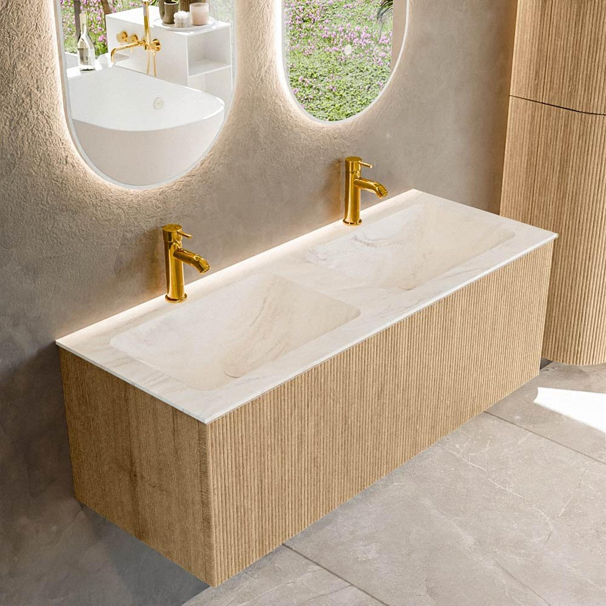 MONDIAZ KURVE-DLUX 120cm badmeubel kleur Oak met 1 lade. Wastafel LEAF dubbel 2 kraangaten kleur Ostra.