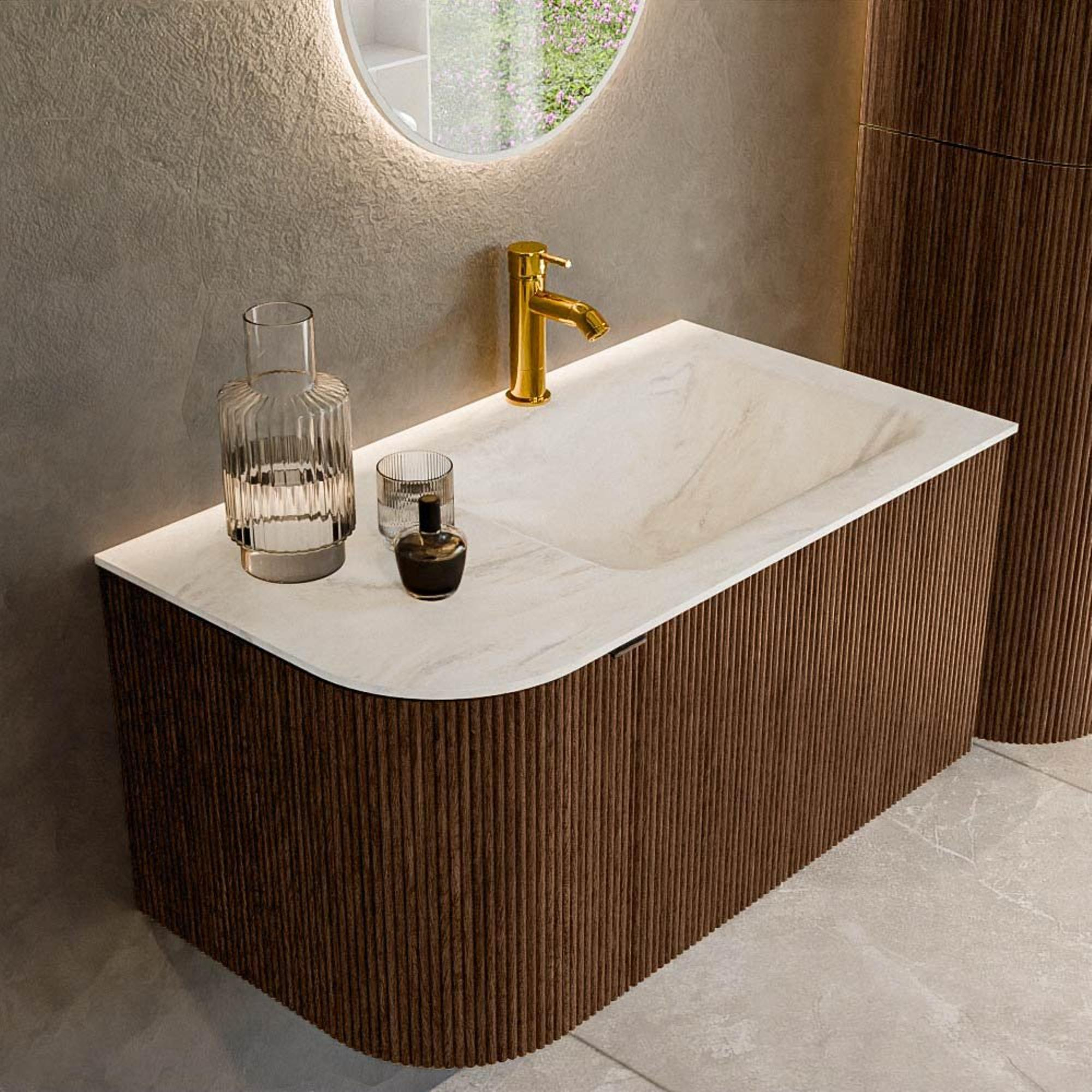 Het ultieme badmeubel dat je badkamer transformeert tot een oase van verfijning. Met zijn halfronde, verticale stroken van massief eiken, verkrijgbaar in de kleuren Oak en Walnut, straalt KURVE vakmanschap uit in elk detail. De zachte rondingen en slim ontworpen deurtjes, elk 40cm hoog, nodigen uit tot gebruik, terwijl de ruimte binnenin optimaal benut wordt dankzij de royale lade van dezelfde hoogte.