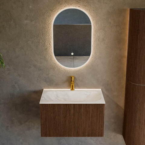 MONDIAZ KURVE-DLUX 70cm badmeubel kleur Walnut met 1 lade. Wastafel BIG SMALL midden 1 kraangat kleur Ostra.