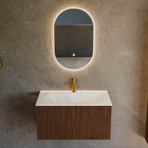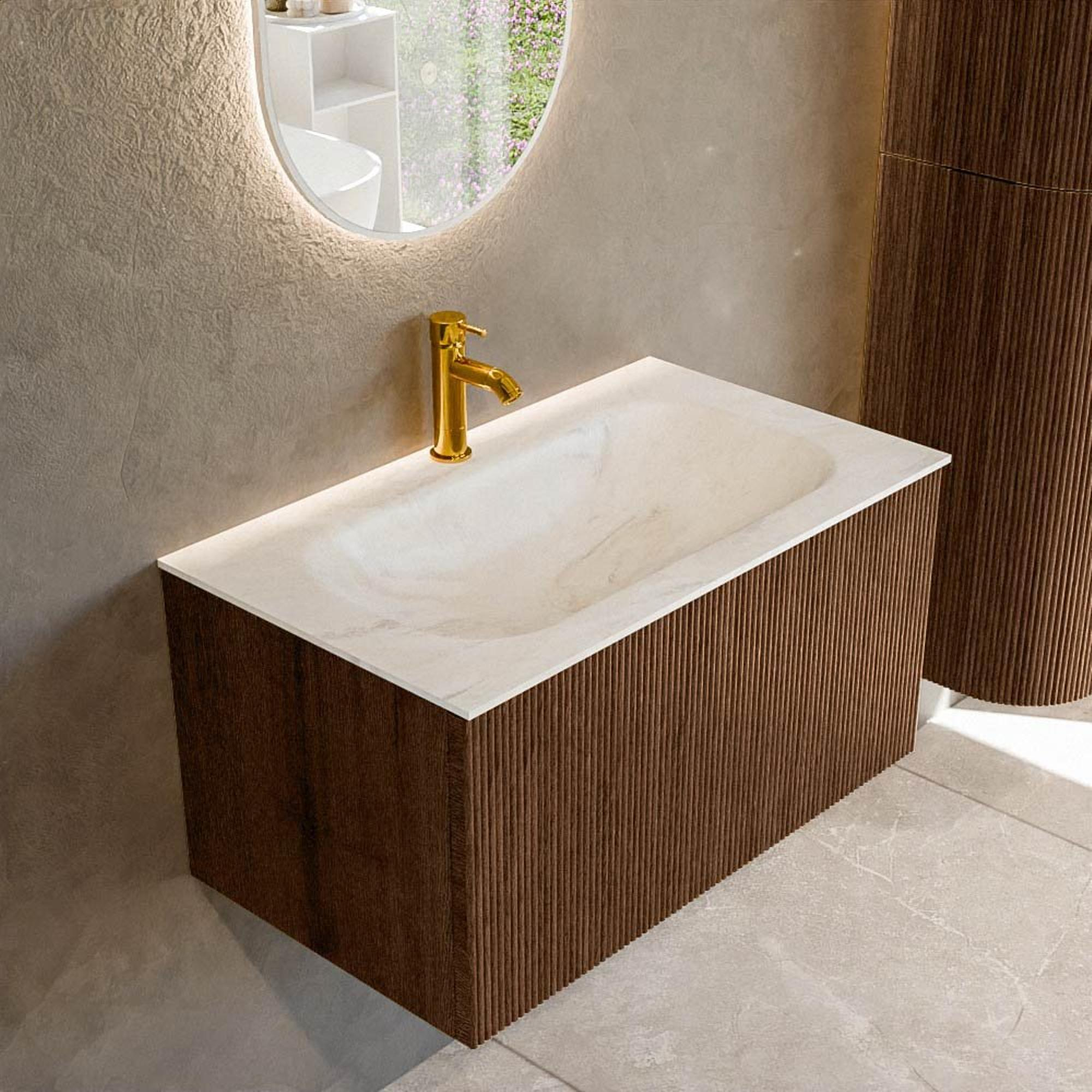 MONDIAZ KURVE-DLUX 80cm badmeubel kleur Walnut met 1 lade. Wastafel BIG SMALL midden 1 kraangat kleur Ostra.