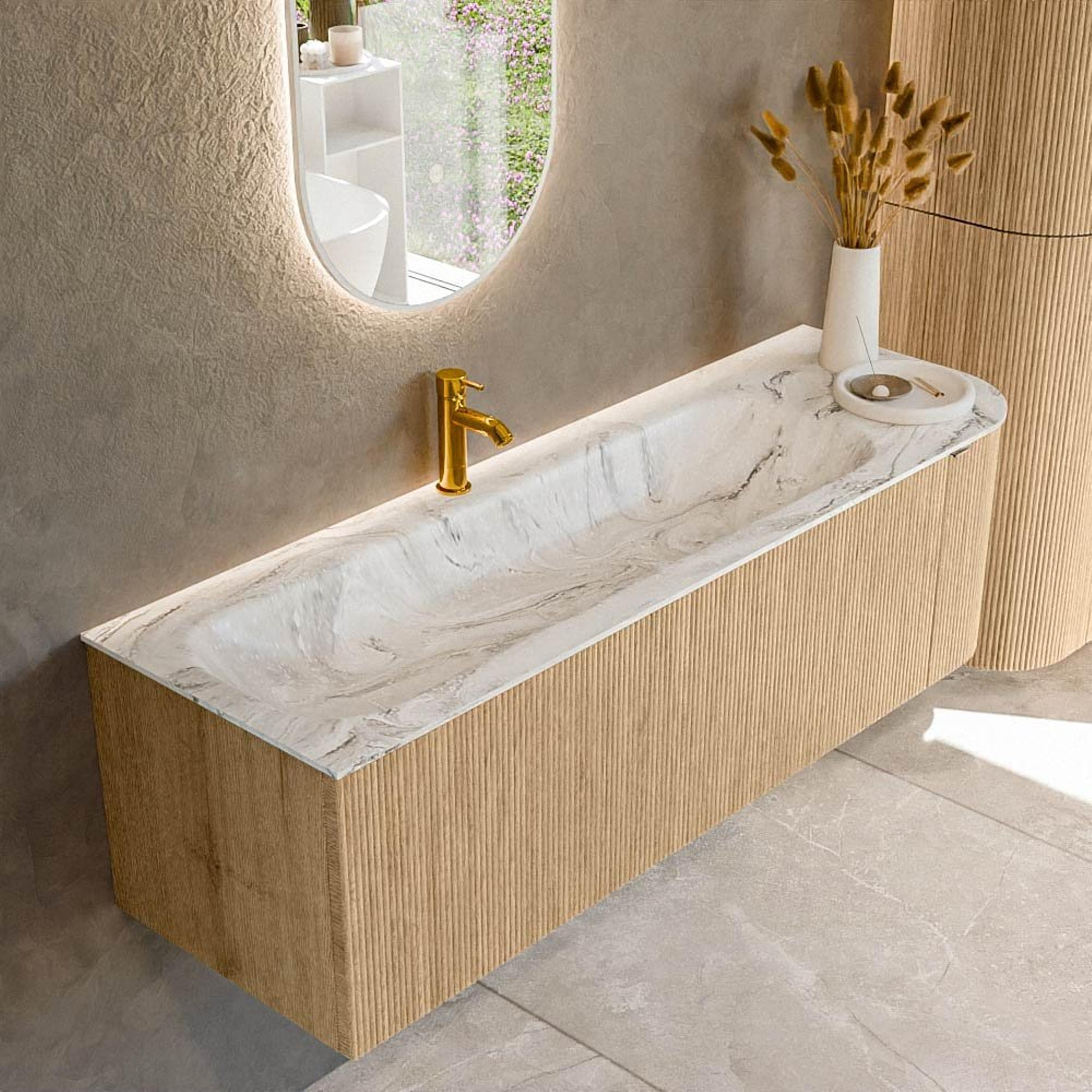 MONDIAZ KURVE-DLUX 145cm badmeubel met module 25 R kleur Oak met 1 lade en 1 deur. Wastafel BIG LARGE links 1 kraangat kleur Glace.