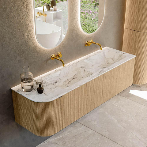 Het ultieme badmeubel dat je badkamer transformeert tot een oase van verfijning. Met zijn halfronde, verticale stroken van massief eiken, verkrijgbaar in de kleuren Oak en Walnut, straalt KURVE vakmanschap uit in elk detail. De zachte rondingen en slim ontworpen deurtjes, elk 40cm hoog, nodigen uit tot gebruik, terwijl de ruimte binnenin optimaal benut wordt dankzij de royale lade van dezelfde hoogte.