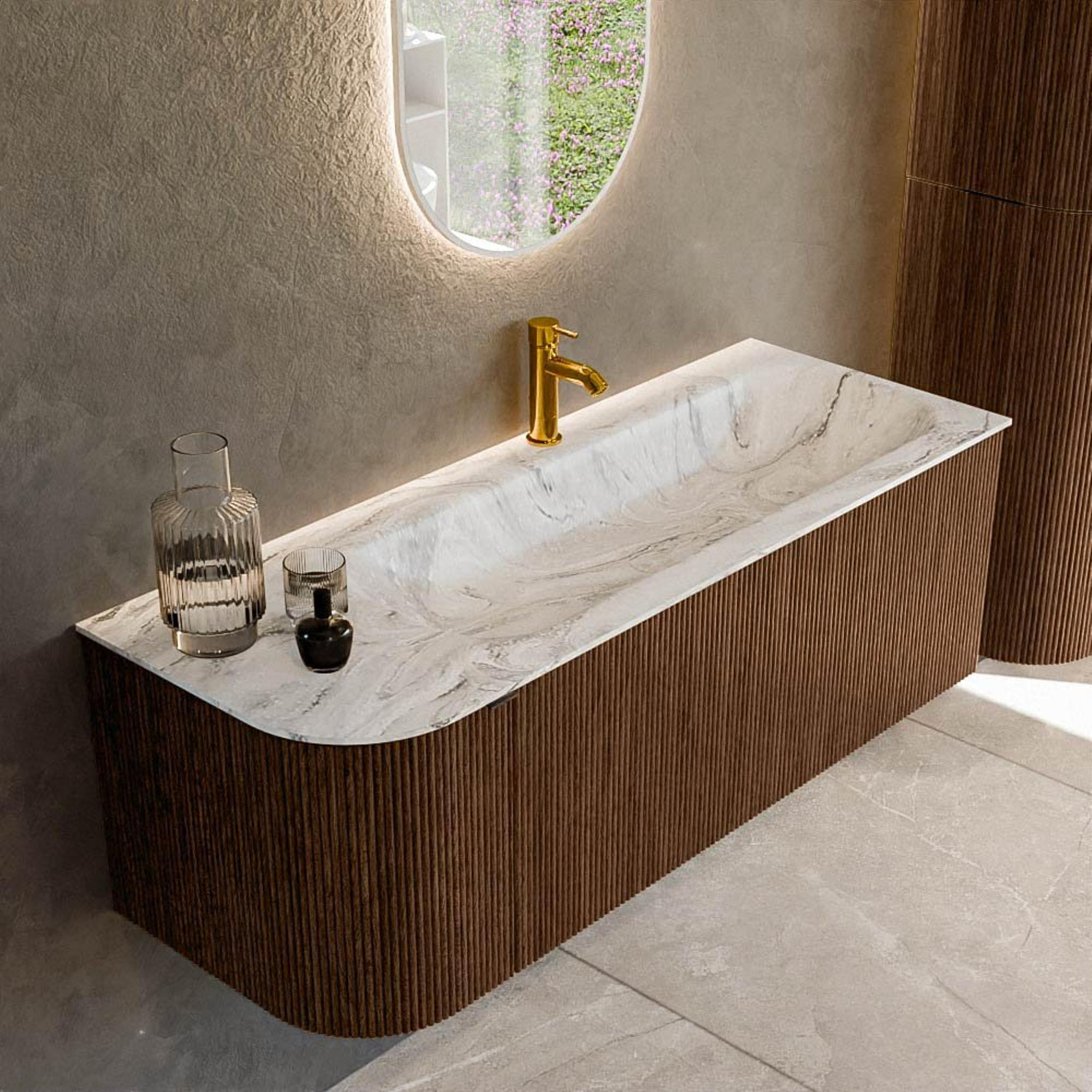 Het ultieme badmeubel dat je badkamer transformeert tot een oase van verfijning. Met zijn halfronde, verticale stroken van massief eiken, verkrijgbaar in de kleuren Oak en Walnut, straalt KURVE vakmanschap uit in elk detail. De zachte rondingen en slim ontworpen deurtjes, elk 40cm hoog, nodigen uit tot gebruik, terwijl de ruimte binnenin optimaal benut wordt dankzij de royale lade van dezelfde hoogte.