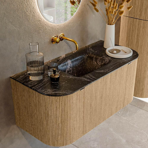 MONDIAZ KURVE-DLUX 100cm badmeubel met module 25 Len R kleur Oak met 1 lade en 2 deuren. Wastafel GRUNNE midden zonder kraangat kleur Lava.