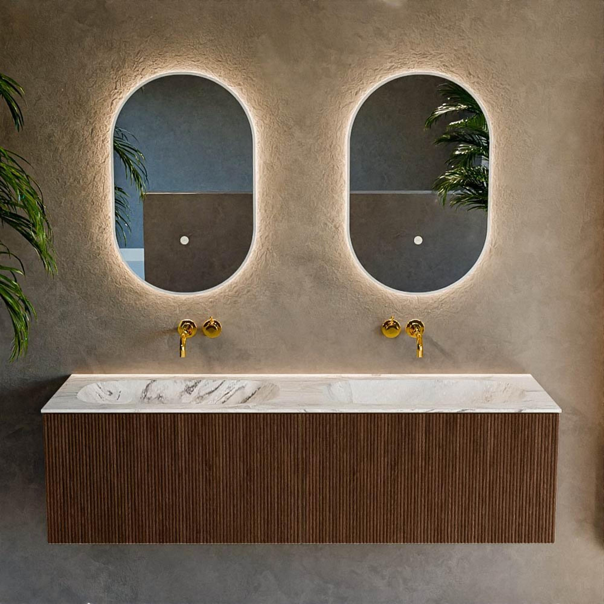 MONDIAZ KURVE-DLUX 150cm badmeubel kleur Walnut met 2 lades. Wastafel STOR SMALL dubbel zonder kraangat kleur Glace.