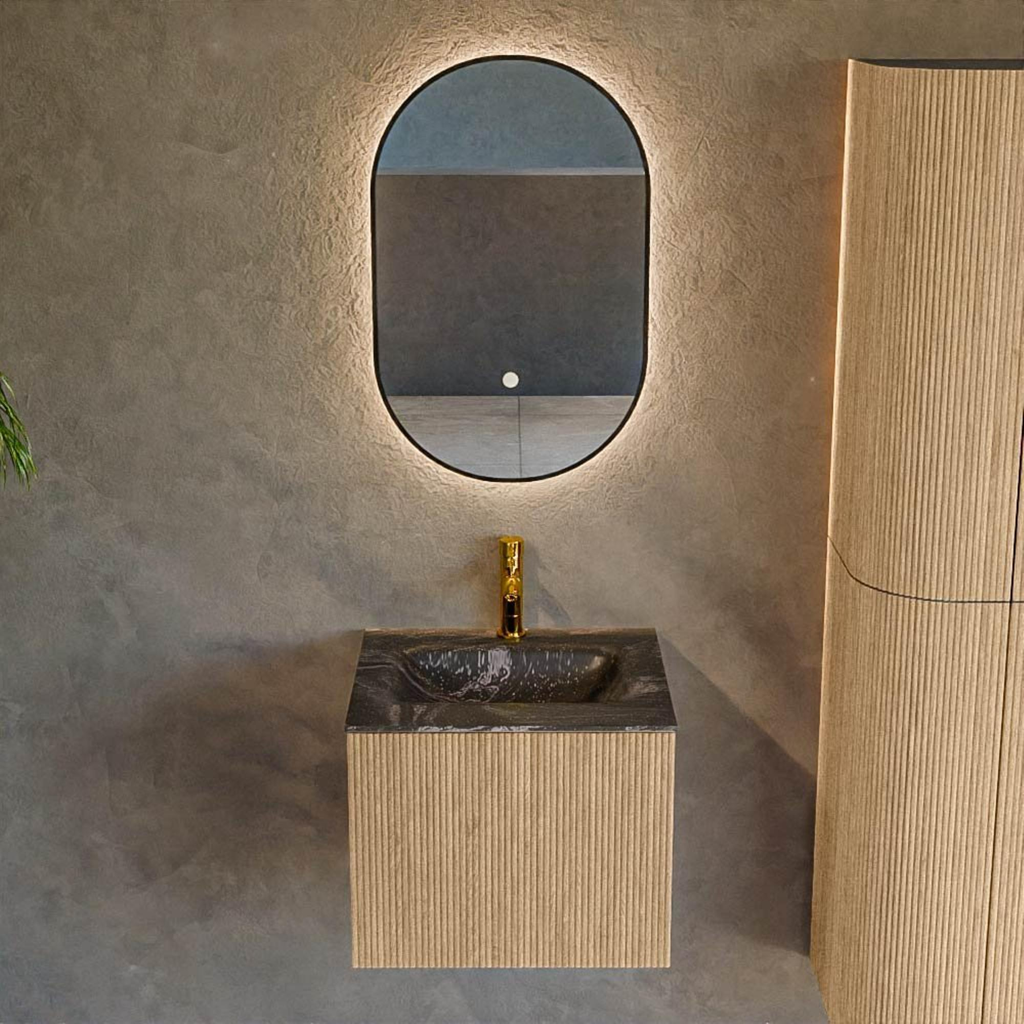 MONDIAZ KURVE-DLUX 50cm badmeubel kleur Oak met 1 lade. Wastafel GRUNNE midden 1 kraangat kleur Lava.