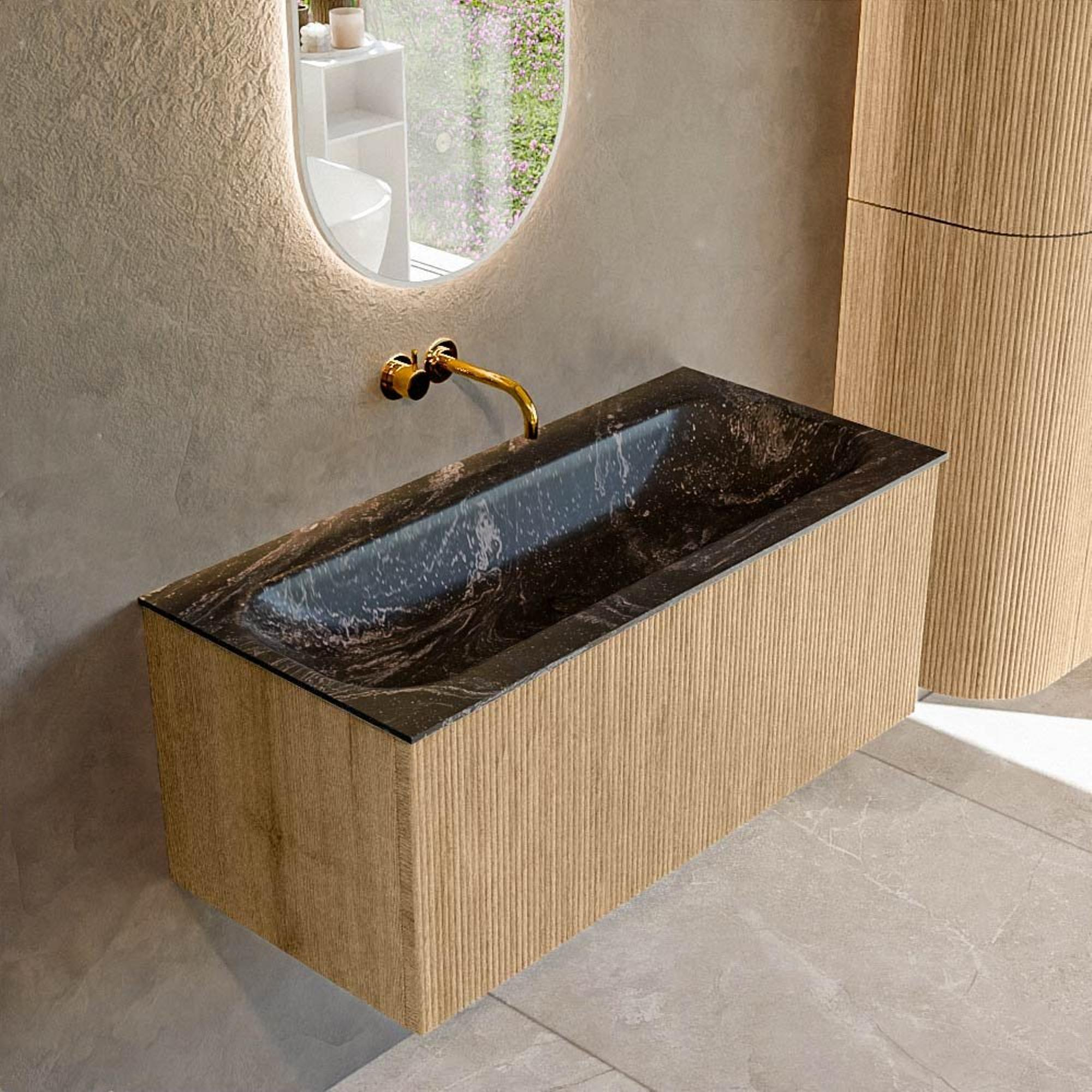 MONDIAZ KURVE-DLUX 100cm badmeubel kleur Oak met 1 lade. Wastafel BIG MEDIUM midden zonder kraangat kleur Lava.