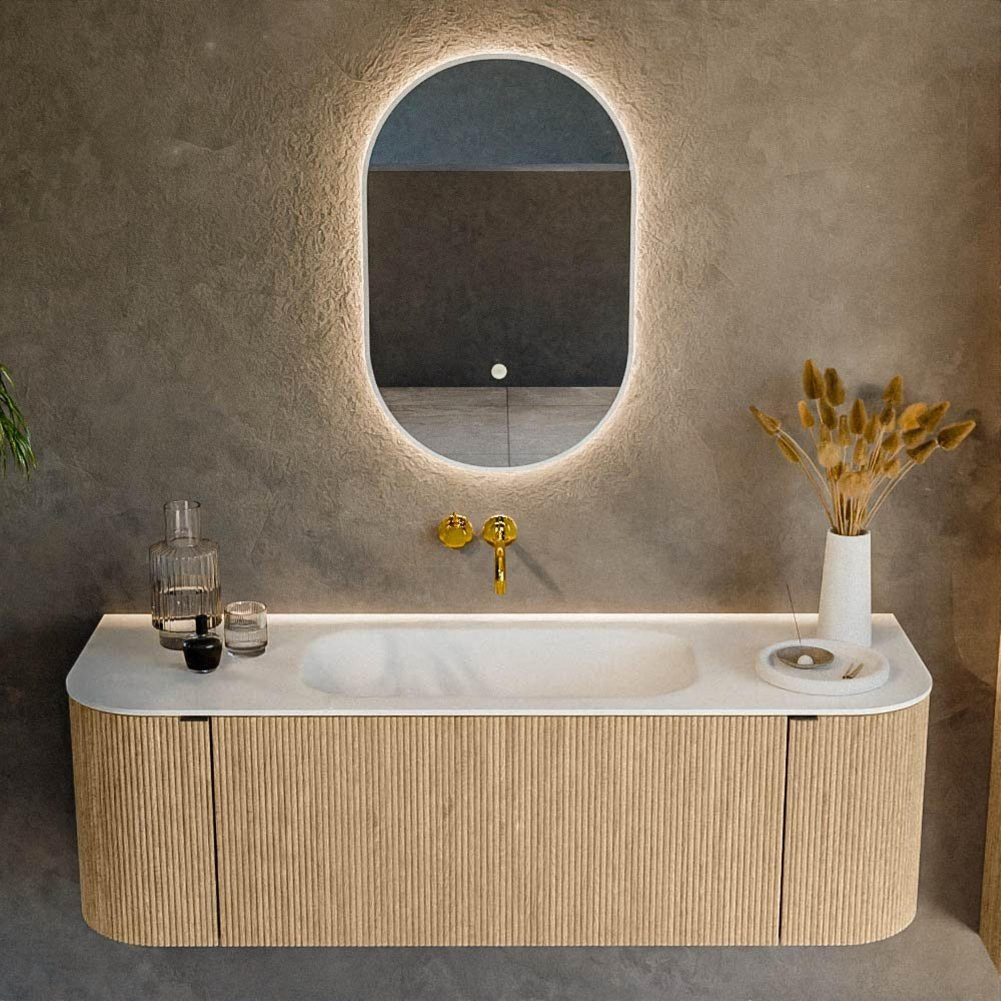 Het ultieme badmeubel dat je badkamer transformeert tot een oase van verfijning. Met zijn halfronde, verticale stroken van massief eiken, verkrijgbaar in de kleuren Oak en Walnut, straalt KURVE vakmanschap uit in elk detail. De zachte rondingen en slim ontworpen deurtjes, elk 40cm hoog, nodigen uit tot gebruik, terwijl de ruimte binnenin optimaal benut wordt dankzij de royale lade van dezelfde hoogte.
