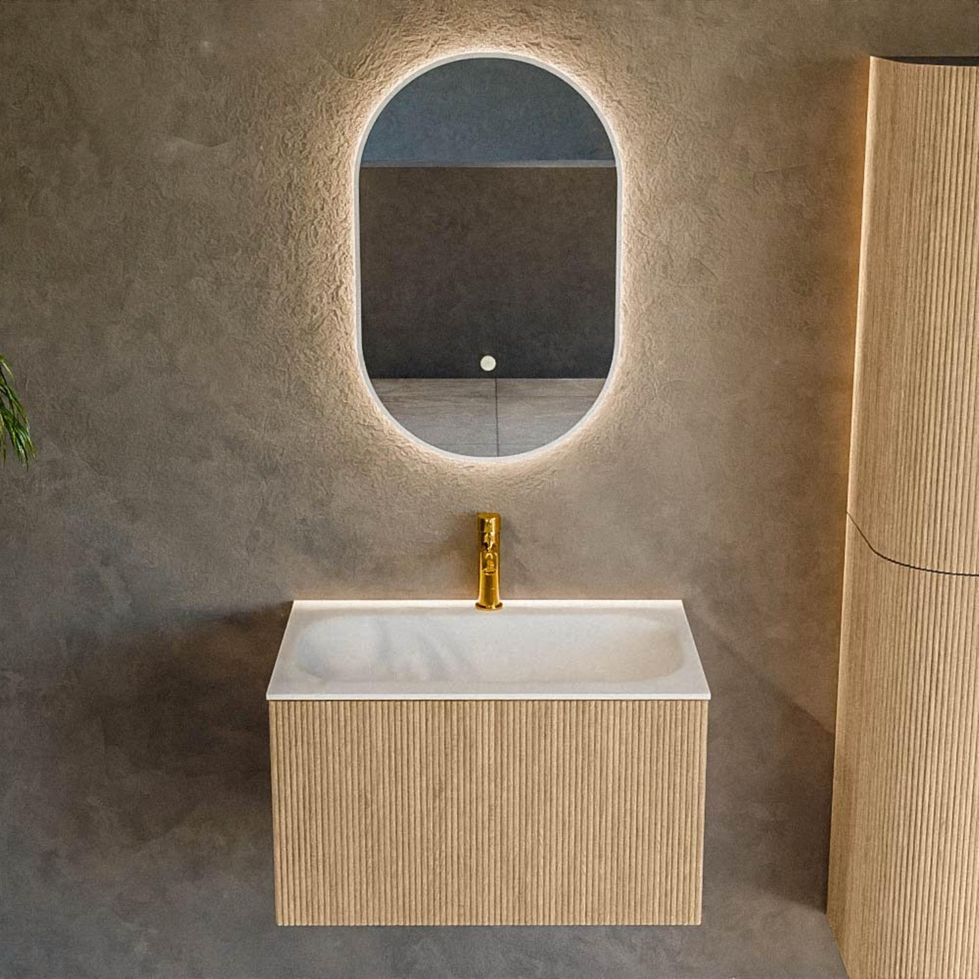 MONDIAZ KURVE 70cm badmeubel kleur Oak met 1 lade. Wastafel BIG SMALL midden 1 kraangat Talc.