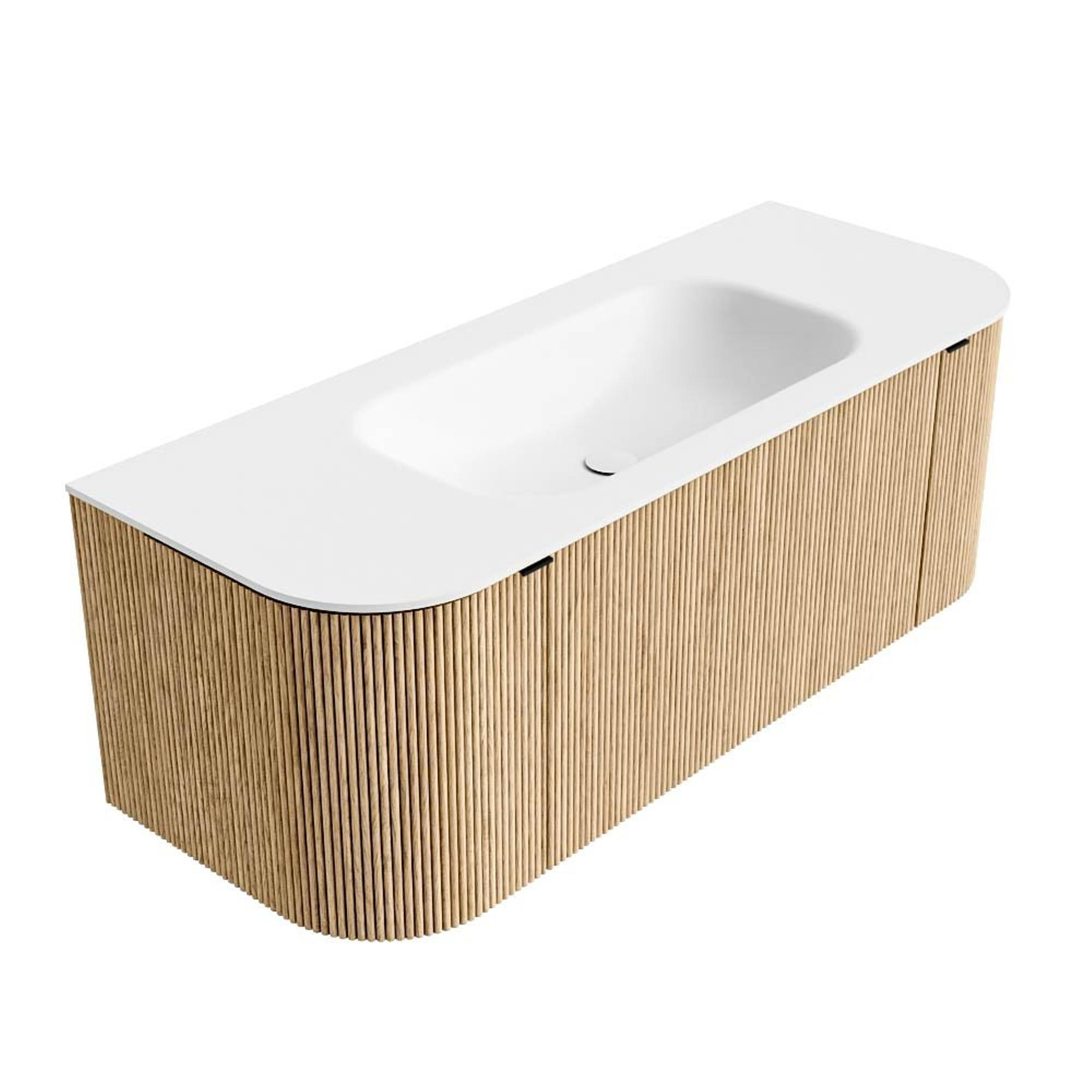 Het ultieme badmeubel dat je badkamer transformeert tot een oase van verfijning. Met zijn halfronde, verticale stroken van massief eiken, verkrijgbaar in de kleuren Oak en Walnut, straalt KURVE vakmanschap uit in elk detail. De zachte rondingen en slim ontworpen deurtjes, elk 40cm hoog, nodigen uit tot gebruik, terwijl de ruimte binnenin optimaal benut wordt dankzij de royale lade van dezelfde hoogte.