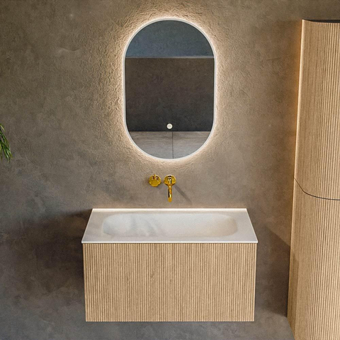 MONDIAZ KURVE 80cm badmeubel kleur Oak met 1 lade. Wastafel BIG SMALL midden zonder kraangat Talc.