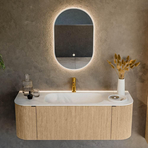 Het ultieme badmeubel dat je badkamer transformeert tot een oase van verfijning. Met zijn halfronde, verticale stroken van massief eiken, verkrijgbaar in de kleuren Oak en Walnut, straalt KURVE vakmanschap uit in elk detail. De zachte rondingen en slim ontworpen deurtjes, elk 40cm hoog, nodigen uit tot gebruik, terwijl de ruimte binnenin optimaal benut wordt dankzij de royale lade van dezelfde hoogte.