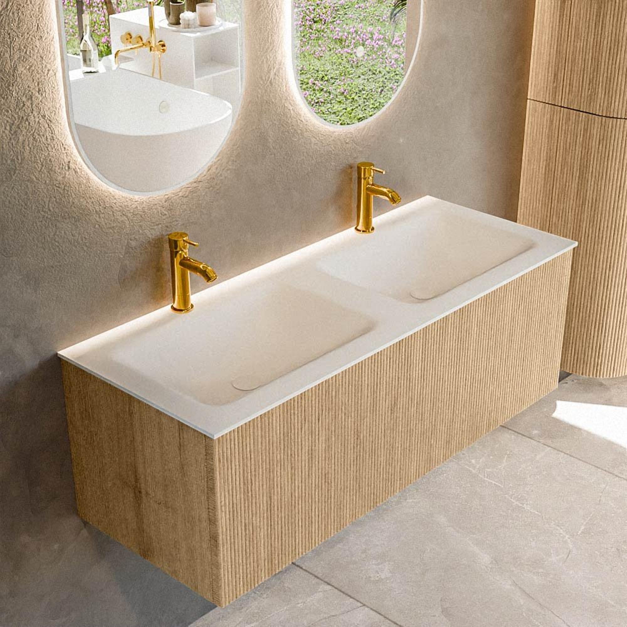 MONDIAZ KURVE 120cm badmeubel kleur Oak met 1 lade. Wastafel CLOUD dubbel 2 kraangaten Talc.